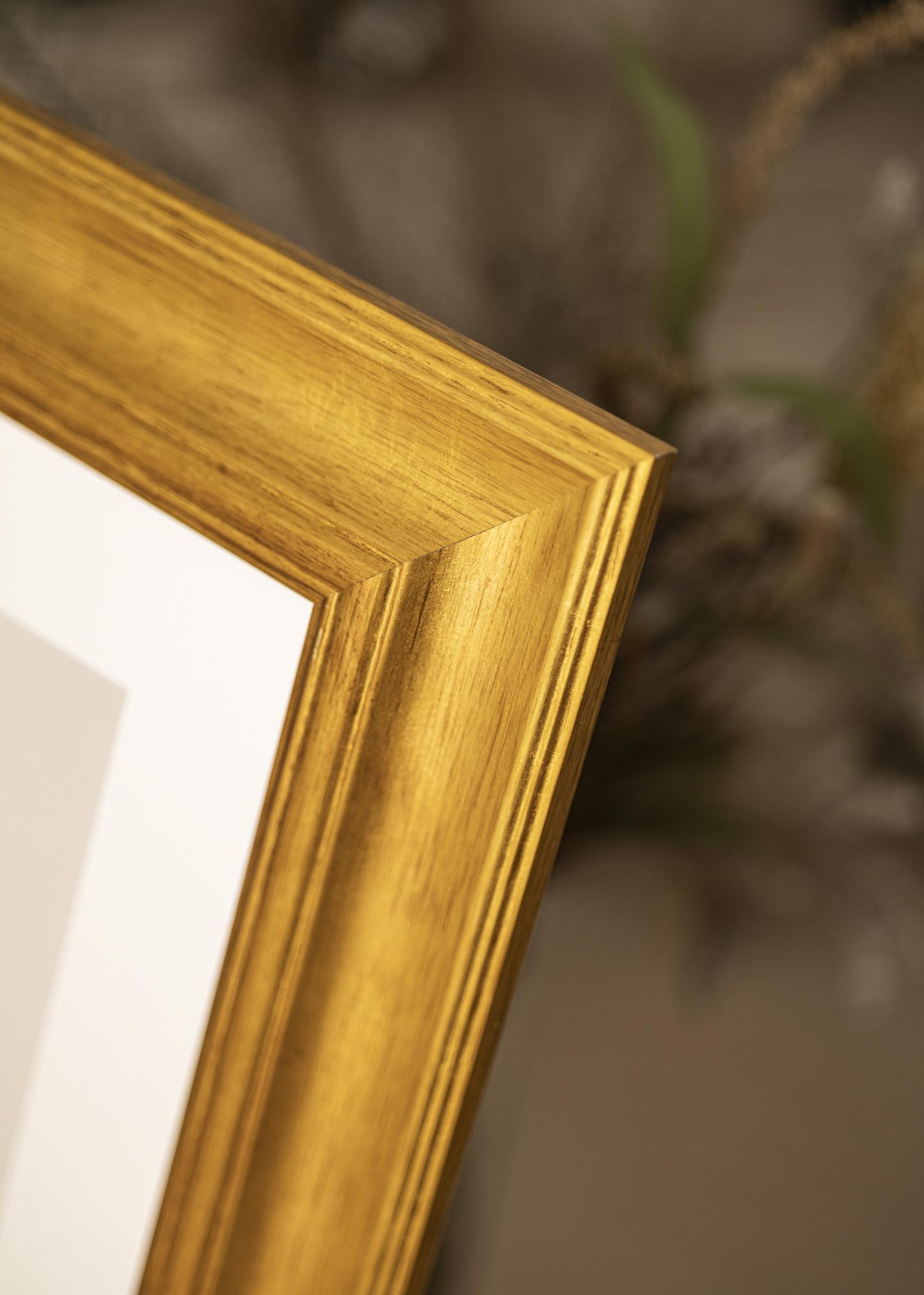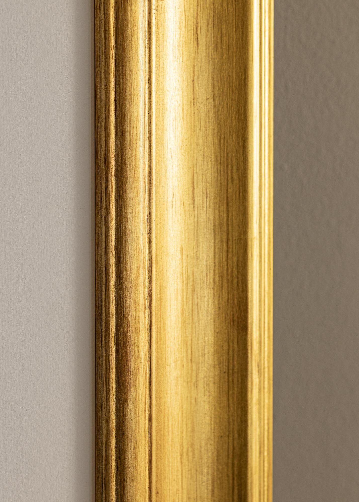 Kehyksen harjattu pinta sisältää hienovaraisia vaihteluita, jotka luovat kevyesti patinoituneen tunteen ja antavat sisustuksellesi ylimääräisen ulottuvuuden. Ohuet linjat reunojen varrella lisäävät hienostunutta yksityiskohtaisuutta, ja lämmin kullan sävy tehostaa kehyksen klassista ilmettä. Tämä tekee siitä erinomaisen valinnan sekä moderneihin että perinteisiin ympäristöihin.