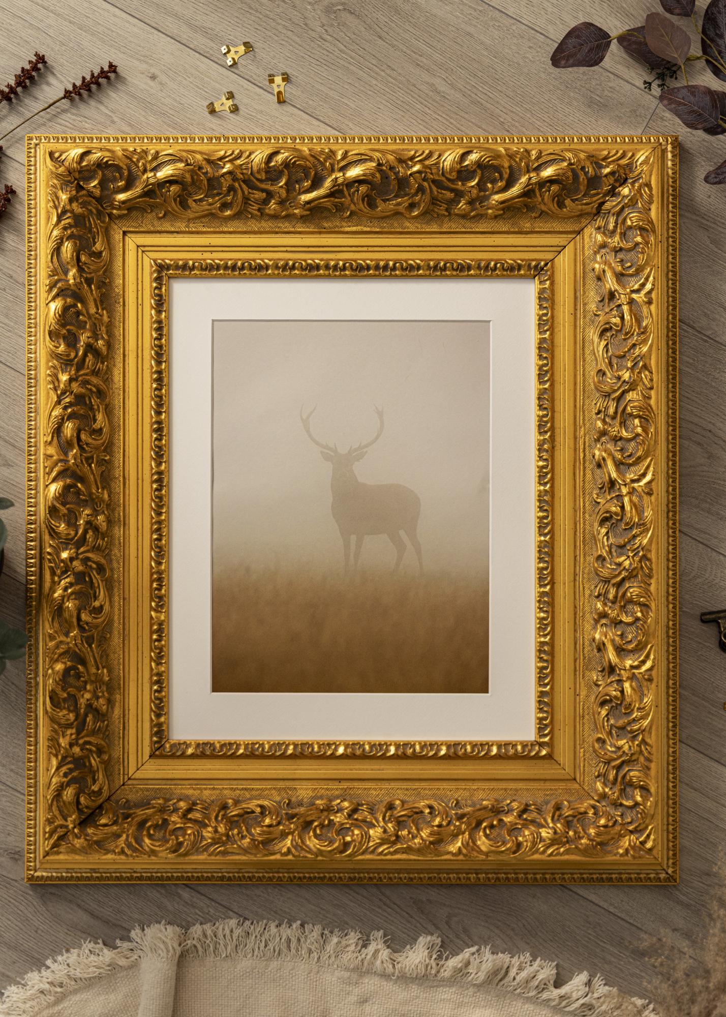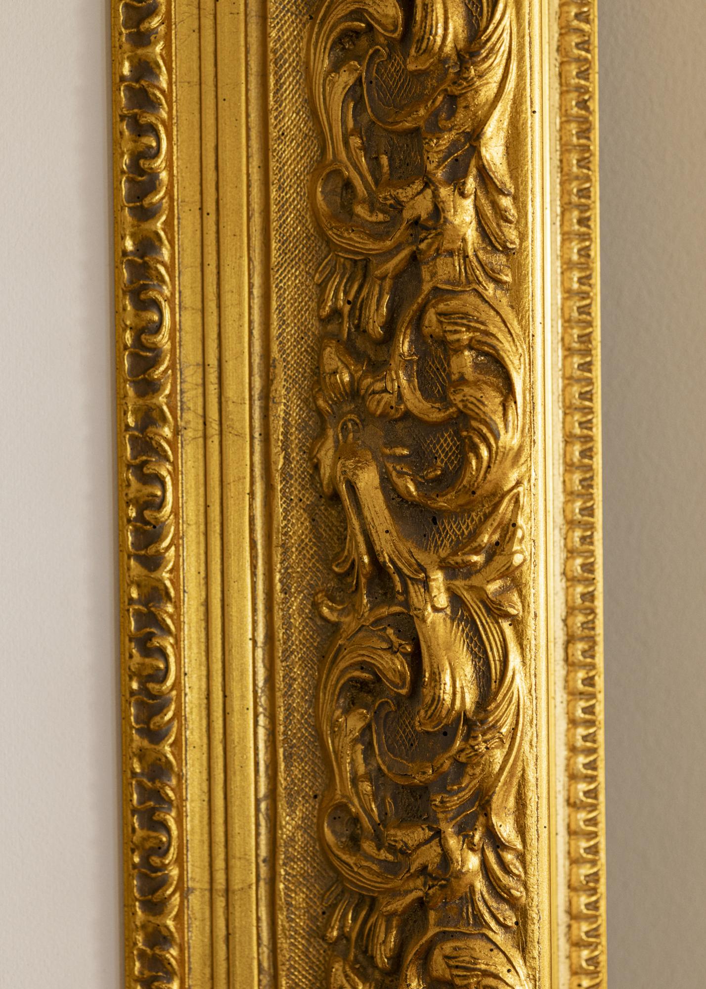 Koristeltu kehys on somistettu kiemuraisilla ornamenteilla ja veistetyillä lehtikuvioilla, mikä luo ajattoman ilmeen. Hieno helminauha kulkee sisäreunaa pitkin, kun taas strukturoidun pinnan ansiosta se antaa antiikkimaisen vaikutelman. Viimeistelyssä on kevyt patina, joka korostaa yksityiskohtaisia koristeita, minkä ansiosta tästä taulunkehyksestä tulee taideteos itsessään.