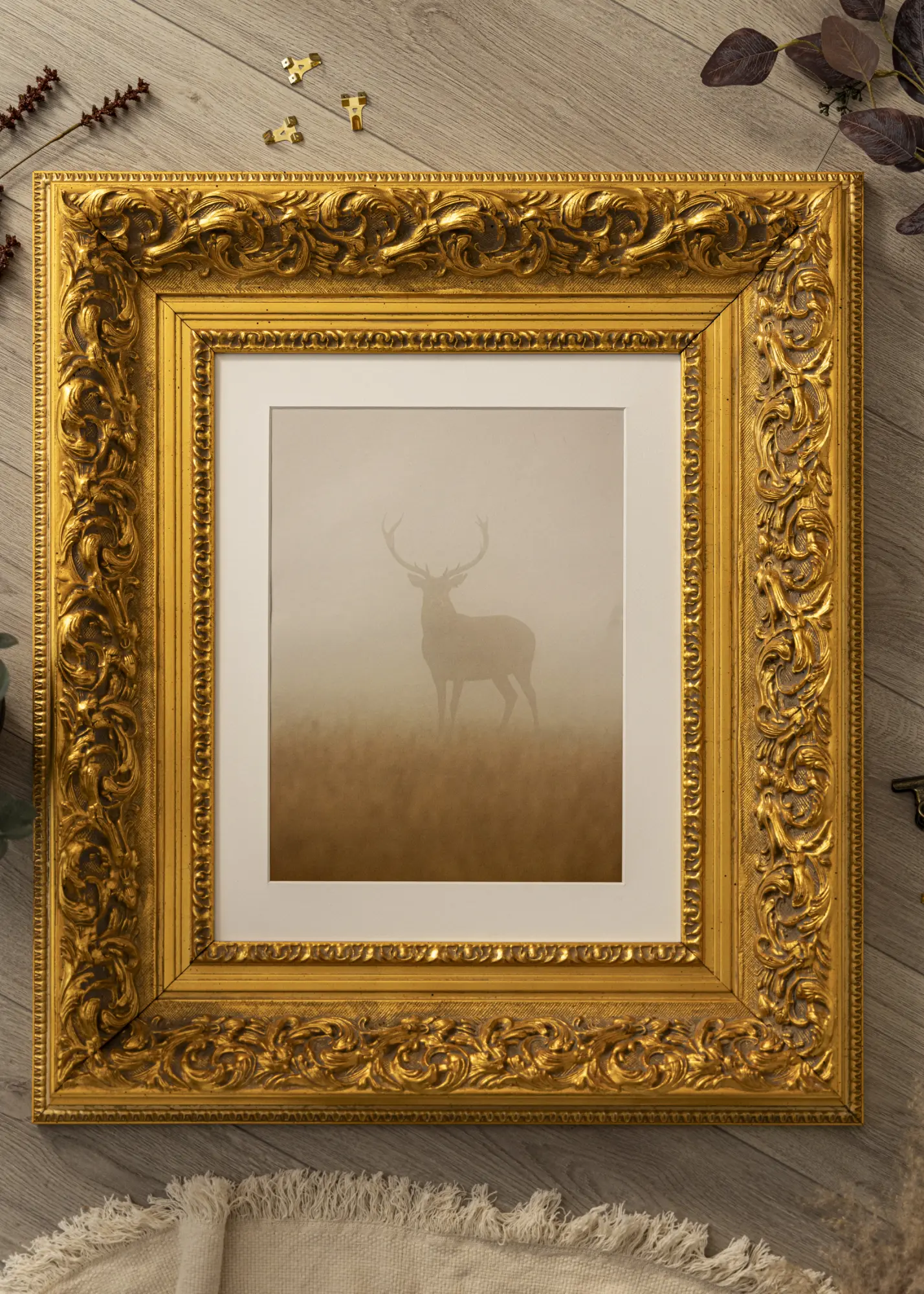 Koristeellinen kehys on koristeltu kiemurtelevilla ornamenteilla ja veistoksellisilla lehtiaiheilla, mikä luo ajattoman ilmeen. Hieno helmireuna kulkee sisäreunaa pitkin, kun taas teksturoitu pinta antaa antiikkisen tunnelman. Viimeistelyssä on kevyt patina, joka korostaa yksityiskohtaisia koristeluja, tehden tästä kehyksestä itsessään taideteoksen.
