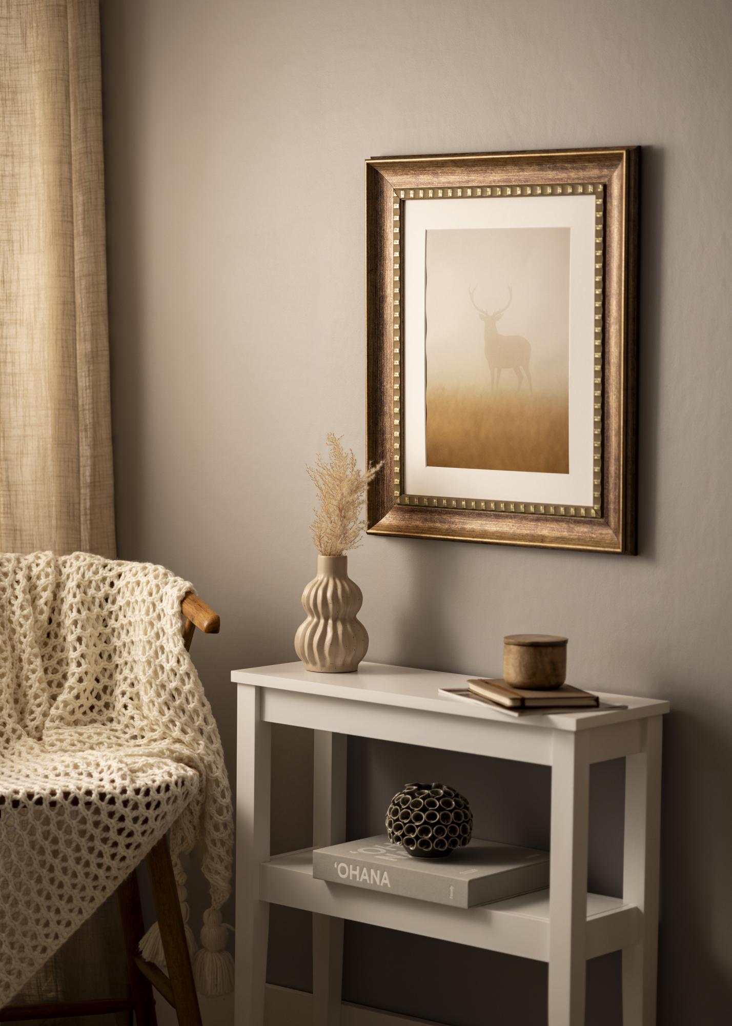 Camden Silver on lämmin ruskea väri, jossa on hienovarainen antiikkiviimeistely, mikä antaa sille rustiikkisen luonteen. Sen pinta on varustettu kevyellä syykuviolla, joka jäljittelee luonnollista puuta ja vahvistaa sen vintage-ilmettä. Sisäkoristusta koristelevat pienet, säännölliset kultaiset yksityiskohdat, jotka luovat elegantin kontrastin tummemman puunsävyyn nähden. Ulkoreunassa on pehmeä viiste, jossa on hillitty kultaviimeistely, antaen valokuvakehykselle ylellisen ja ajattoman tunnelman.