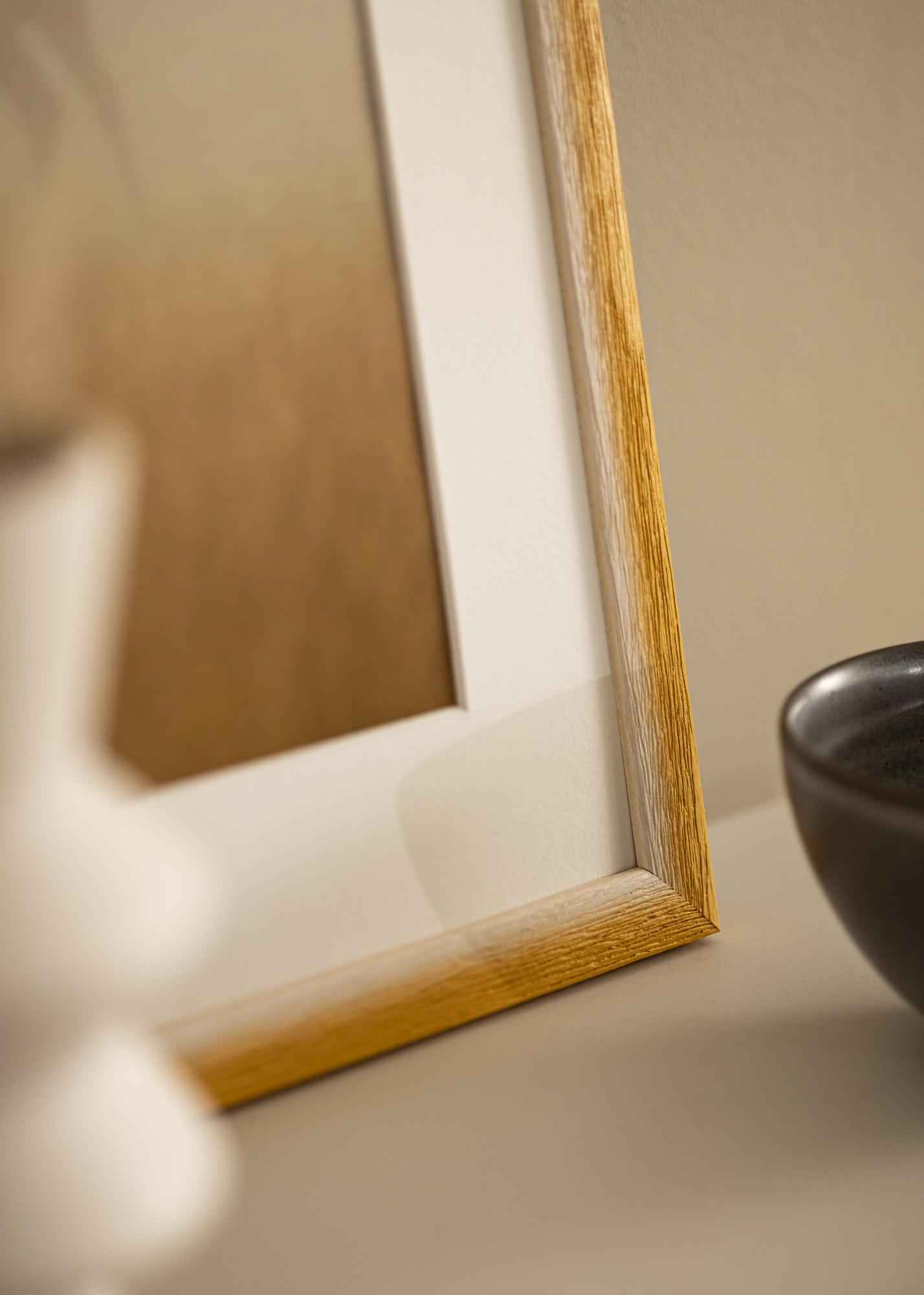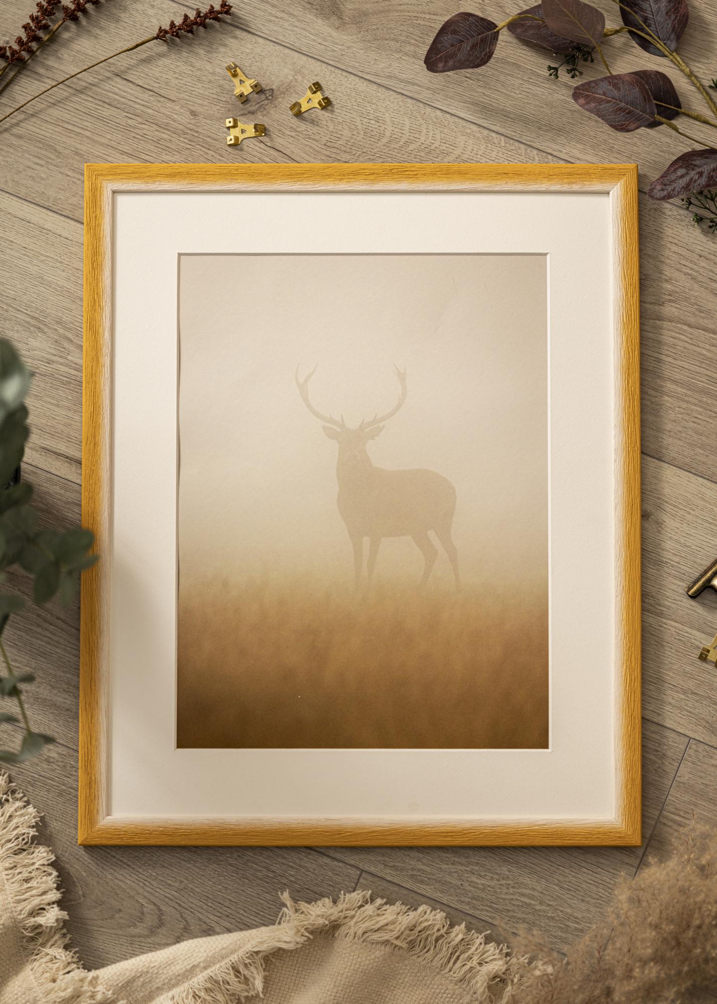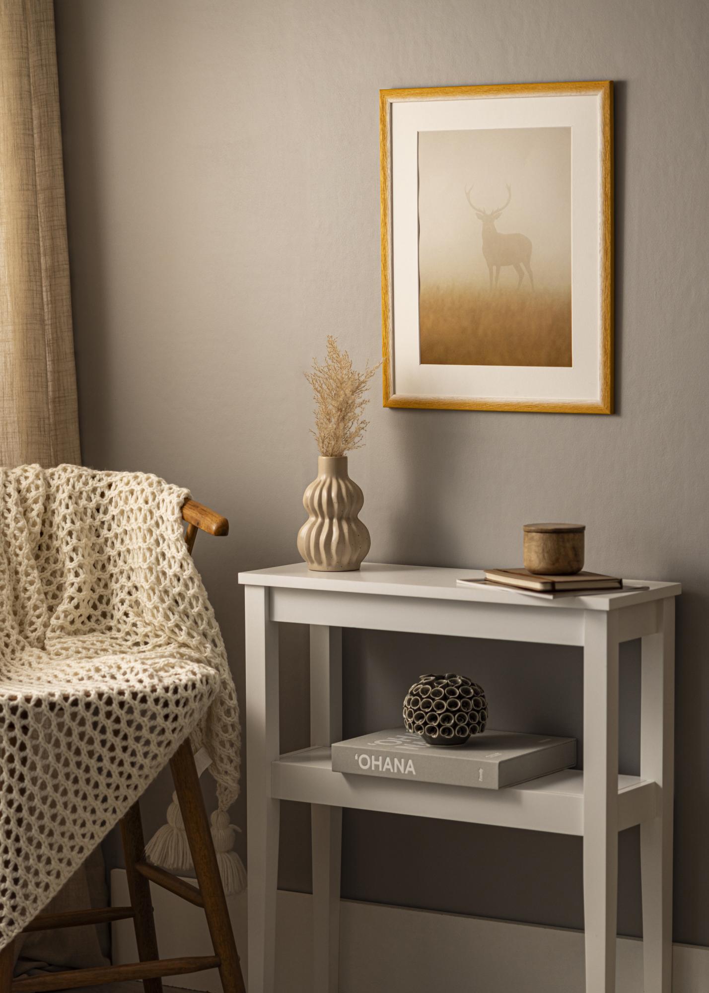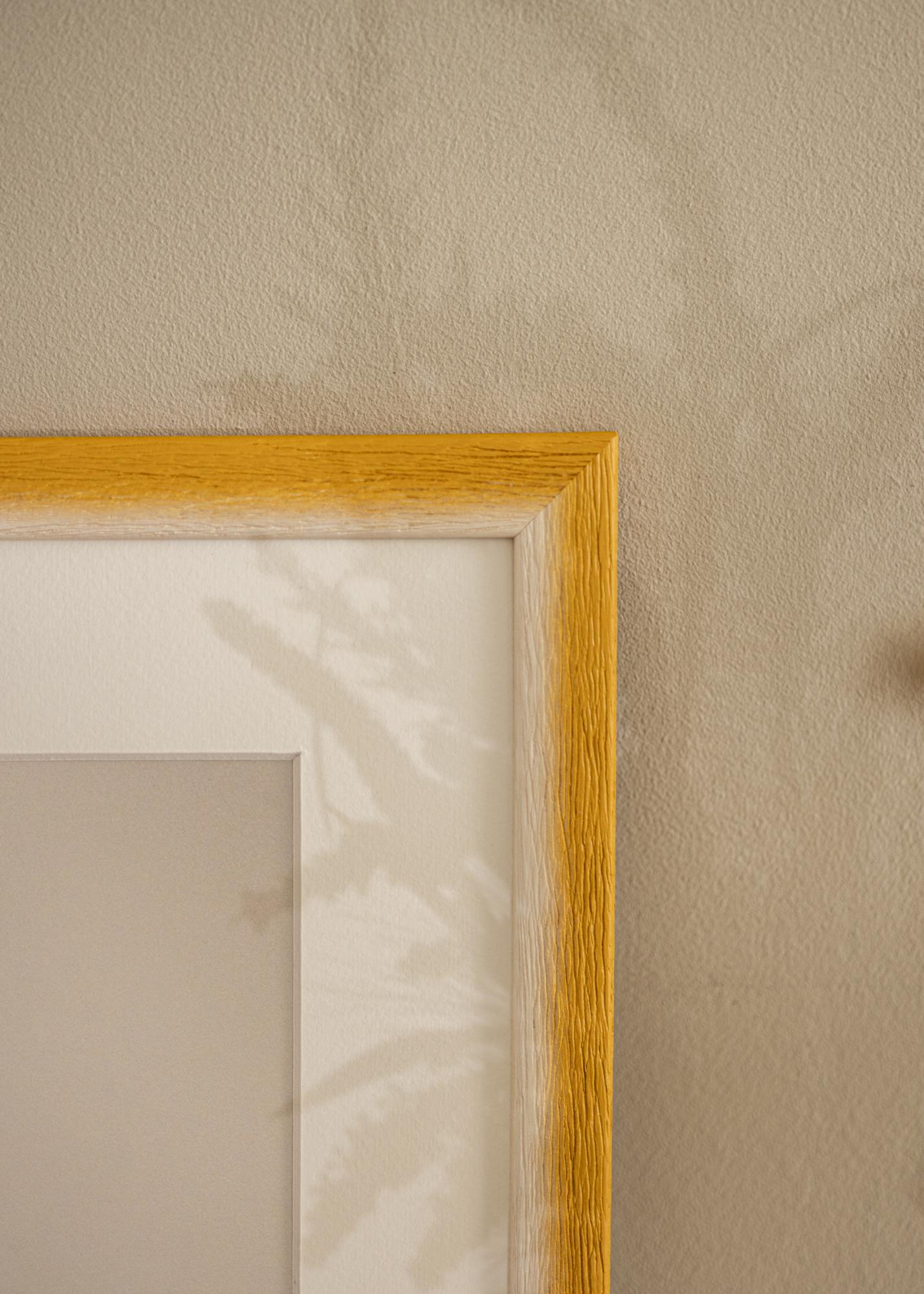 Tässä kehystyksessä on harmoninen väriliukuma vaaleasta, luonnonvalkoisesta sävystä lämpimään okrankeltaiseen sävyyn. Pinta on kohokuvioitu selkeällä puun rakenteella ja syvillä suonilla, jotka luovat käsinkosketeltavan ja luonnollisen tunteen. Hienovarainen värien liukuma luo pehmeän, maalatun ilmeen ja elävän syvyyden, joka korostaa jokaista kuvaa.