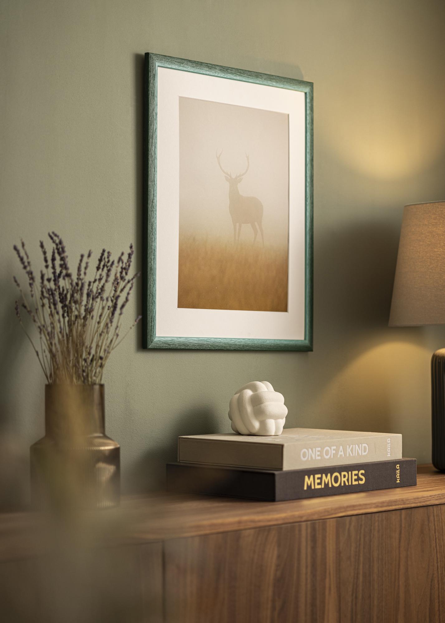 Hillitty vihreä väri sisältää hienovaraisia sävyvaihteluita, jotka antavat eloisan ja luonnollisen ilmeen, kun taas näkyvä puun rakenne syvine syineen luo rustiikkisen tunnelman. Pintaan on lisätty mattapinta, joka pehmentää värin intensiivisyyttä ja antaa pehmeän vaikutelman, jolloin kuvasi voivat todella olla keskiössä. Kapea profiili tasapainottaa rustiikkista ulkonäköä modernilla yksinkertaisuudella.