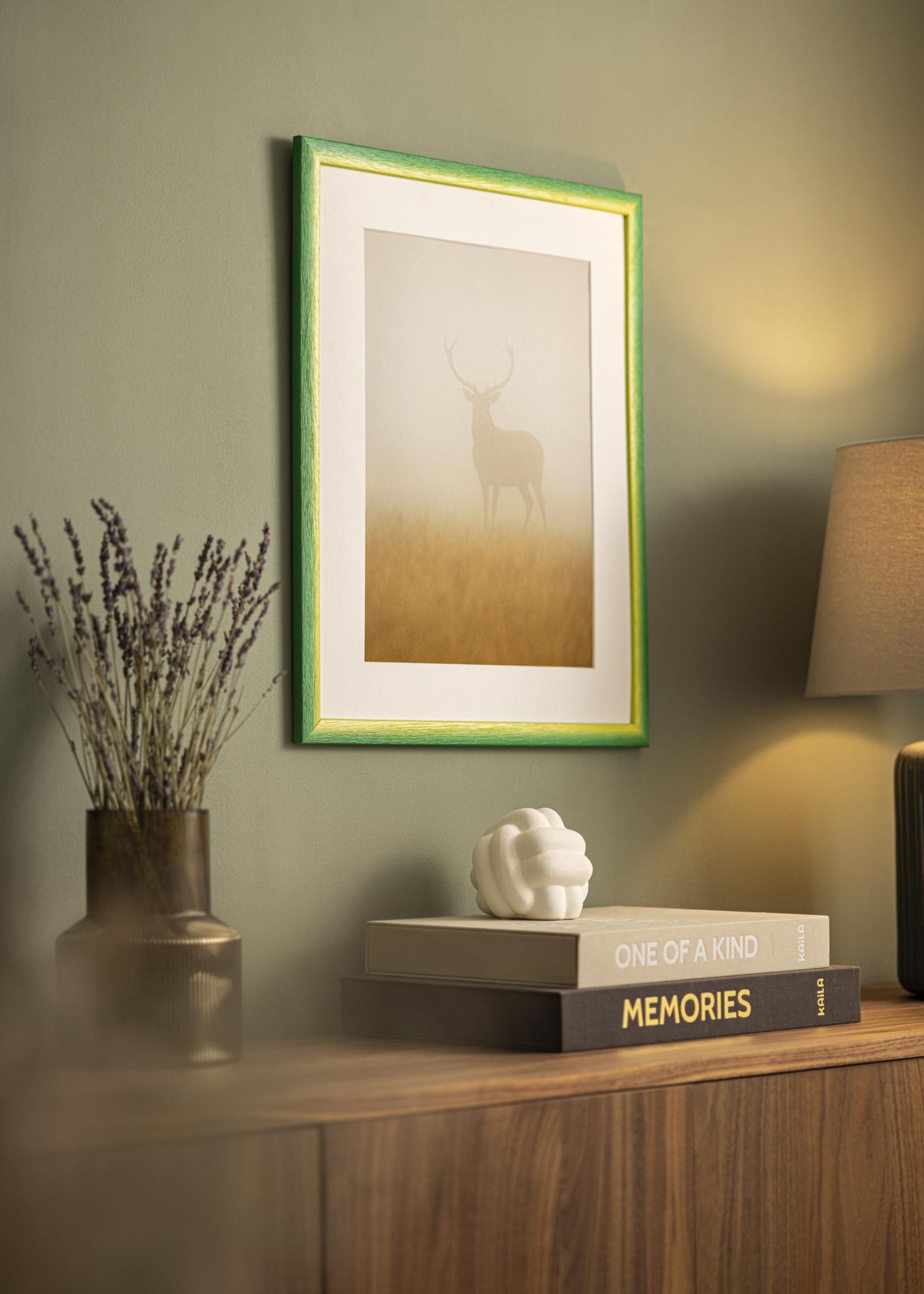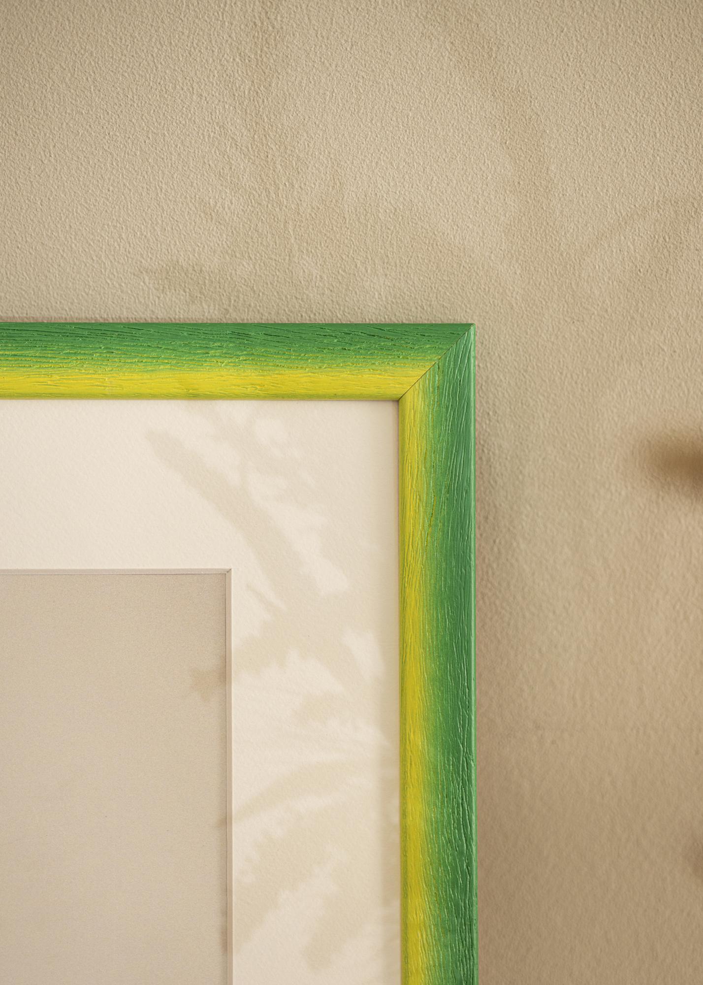 Tutustu mittatilaustyönä valmistettuun Cornwall Vihreä -kehyksen, ainutlaatuiseen valokuvakehykseen, joka valmistetaan suoraan omassa kehystämössämme. Eläväisen värimaailmansa ansiosta, jossa auringonkeltaiset sävyt sulautuvat pehmeästi rehevään vihreään, tämä kehys on taideteos itsessään. Sen erottuva puun rakenne syvine syineen luo sekä kosketeltavan tunteen että käsinmaalatun vaikutelman, joka korostaa orgaanista ilmettä.
