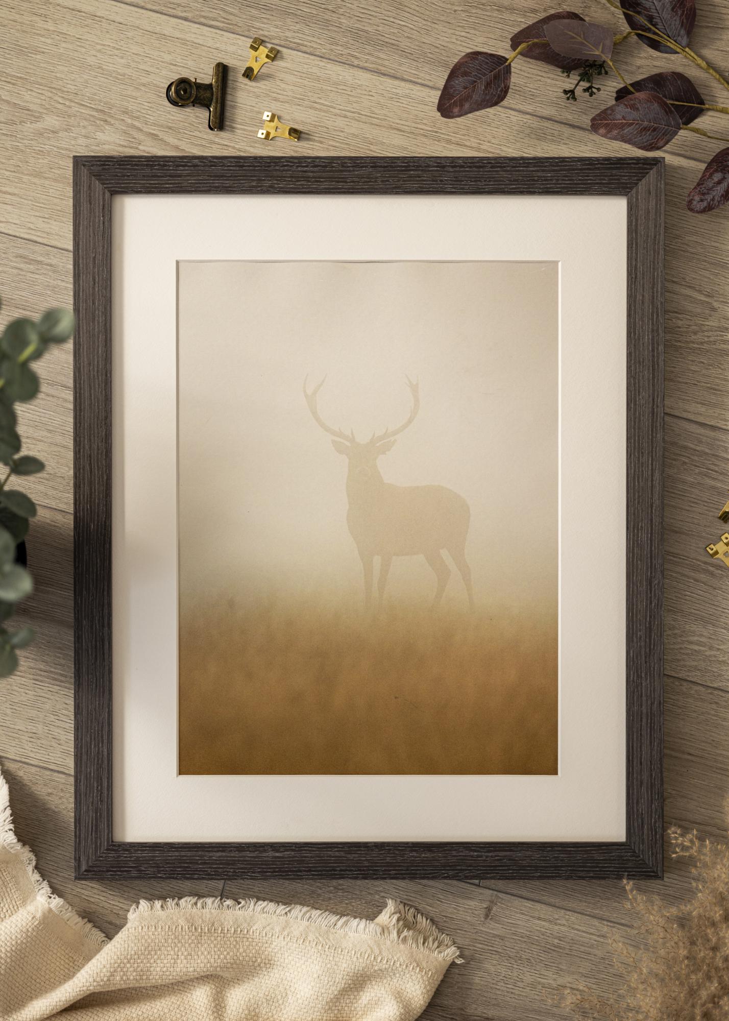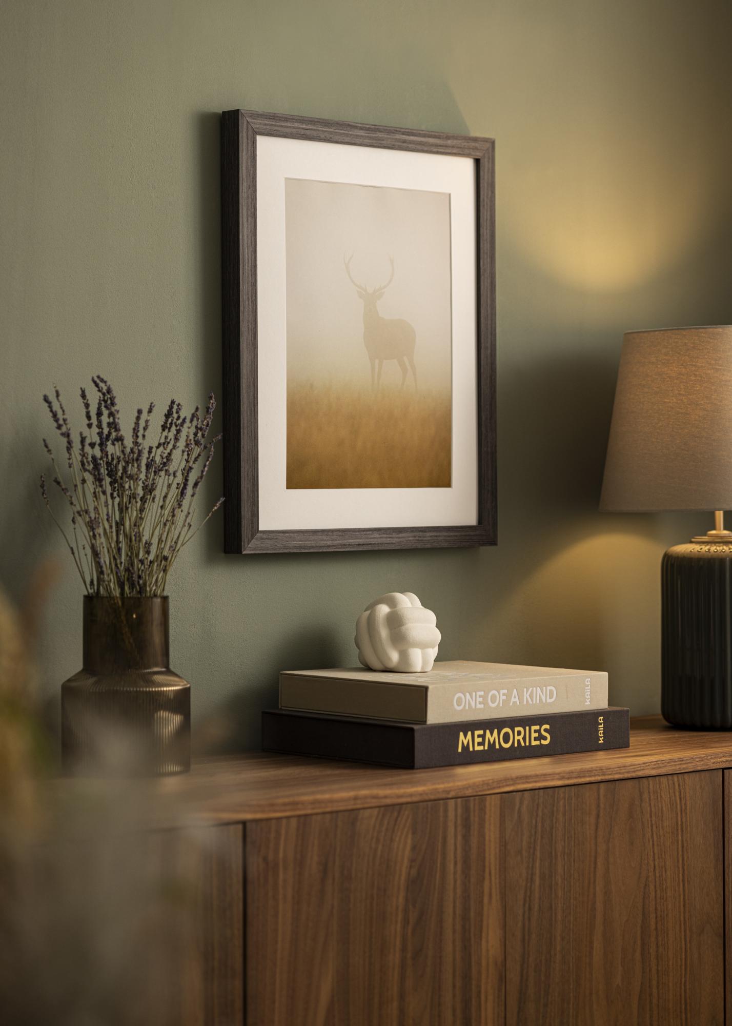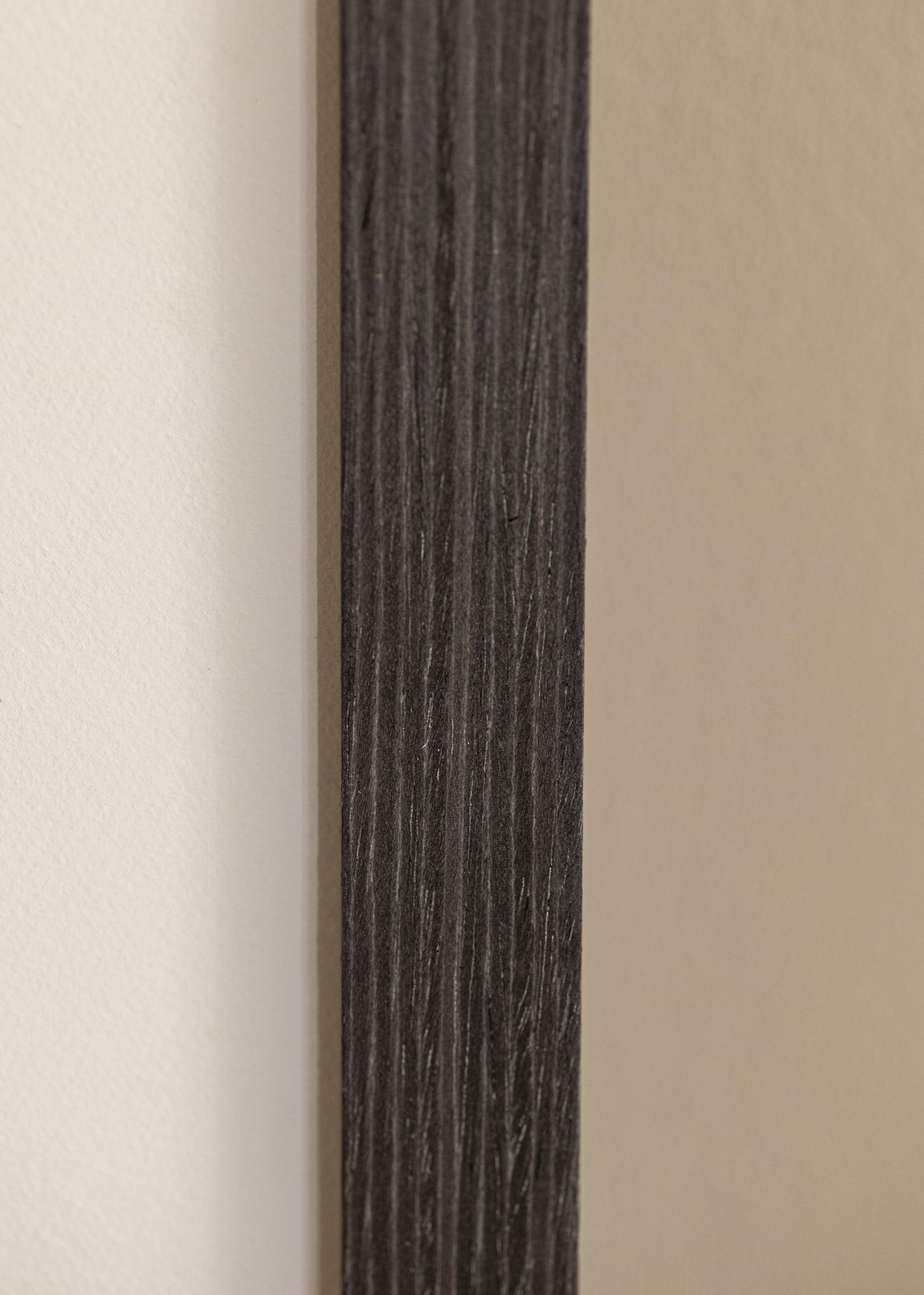 Tämä taulunkehys on valmistettu männystä ja siinä on tumma puuviimeistely, jossa on selkeästi juovainen rakenne. Syvä, lähes mustanruskea sävy antaa puun luonnollisen tekstuurin näkyä kevyen mattapinnan läpi, korostaen sen luonnollista ulkonäköä. Kapea ja suoraviivainen profiili antaa hillityn ja tyylikkään ilmeen, joka sopii useimpiin ympäristöihin.