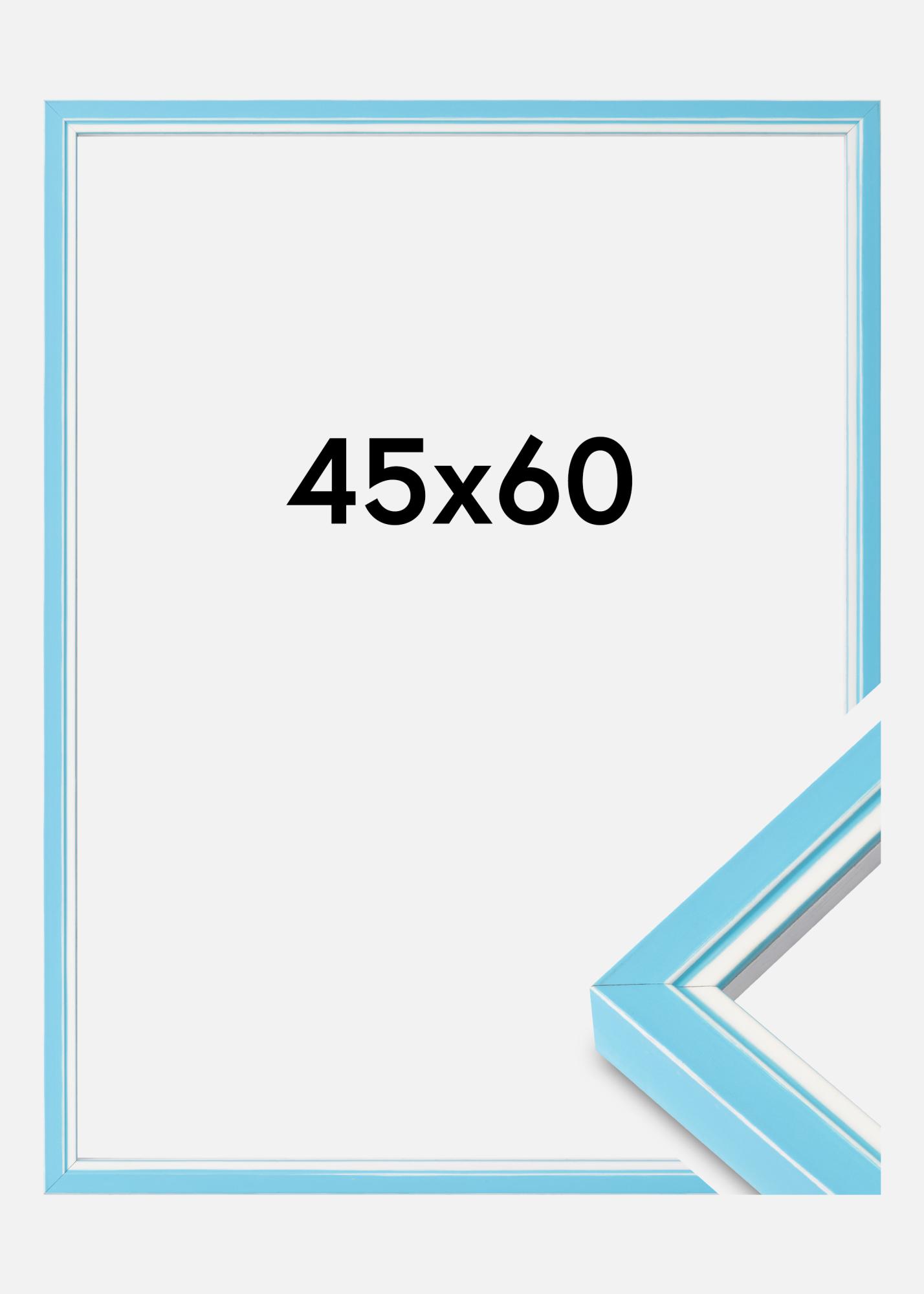 Raamin vaaleansininen ja valkoinen väri antaa raikkaan ja leikkisän tunnelman, joka täydentää huoneen muuta sisustusta. Raamin kehyksen leveys on 20 mm, joten se luo kauniin kehyksen ilman että se vallitsee koko motiivia.