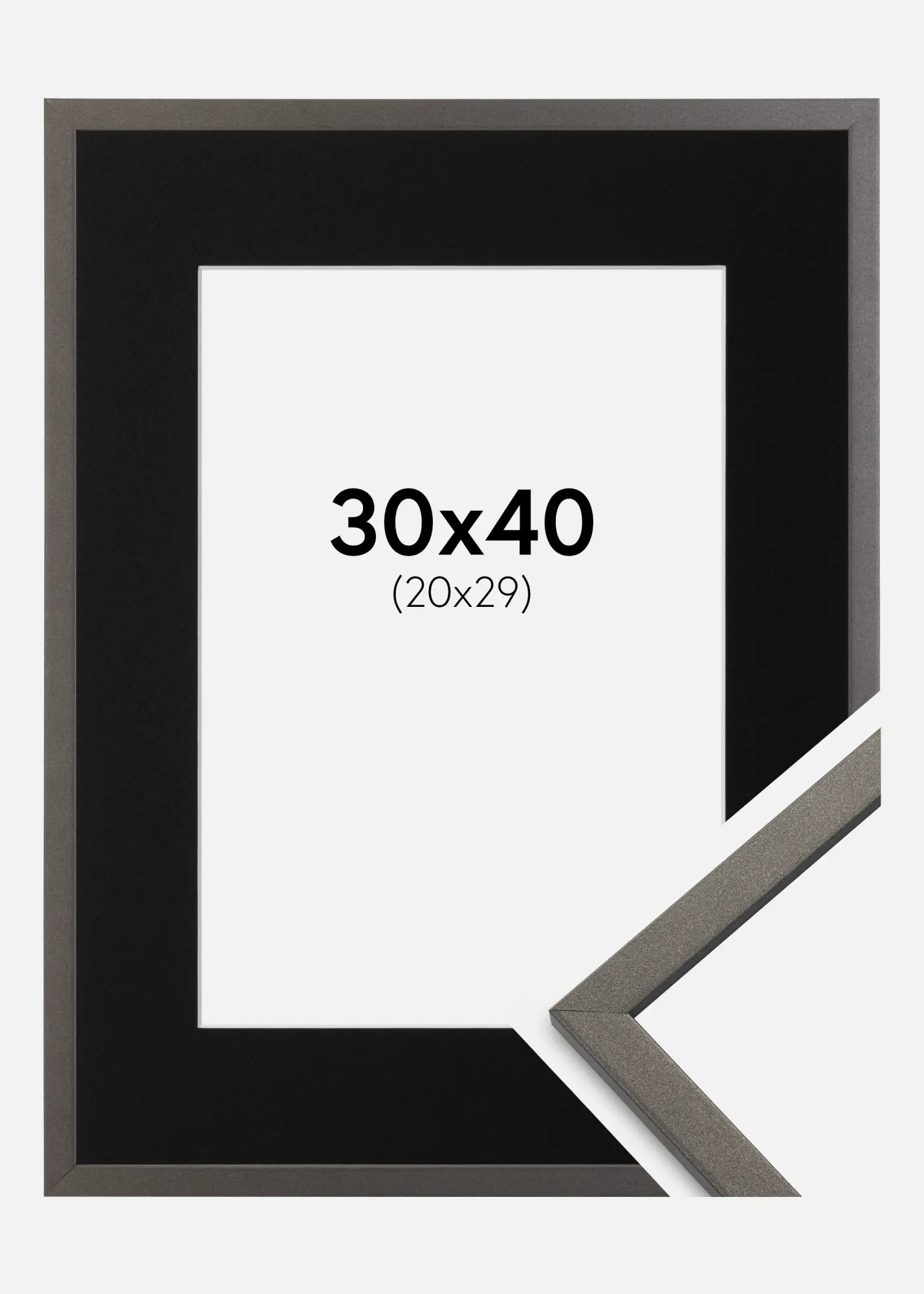 Paketti, johon kuuluu kehys ja kehykseen sopiva musta paspatuuri. Tuotekuvassa näet kehyksen mitat (lihavoituna) ja paspatuurin sisämitat (suluissa). Huomioi, että paspatuurin sisämittojen tulee olla aina 1 cm pienemmät kuin haluttu kuvakoko.