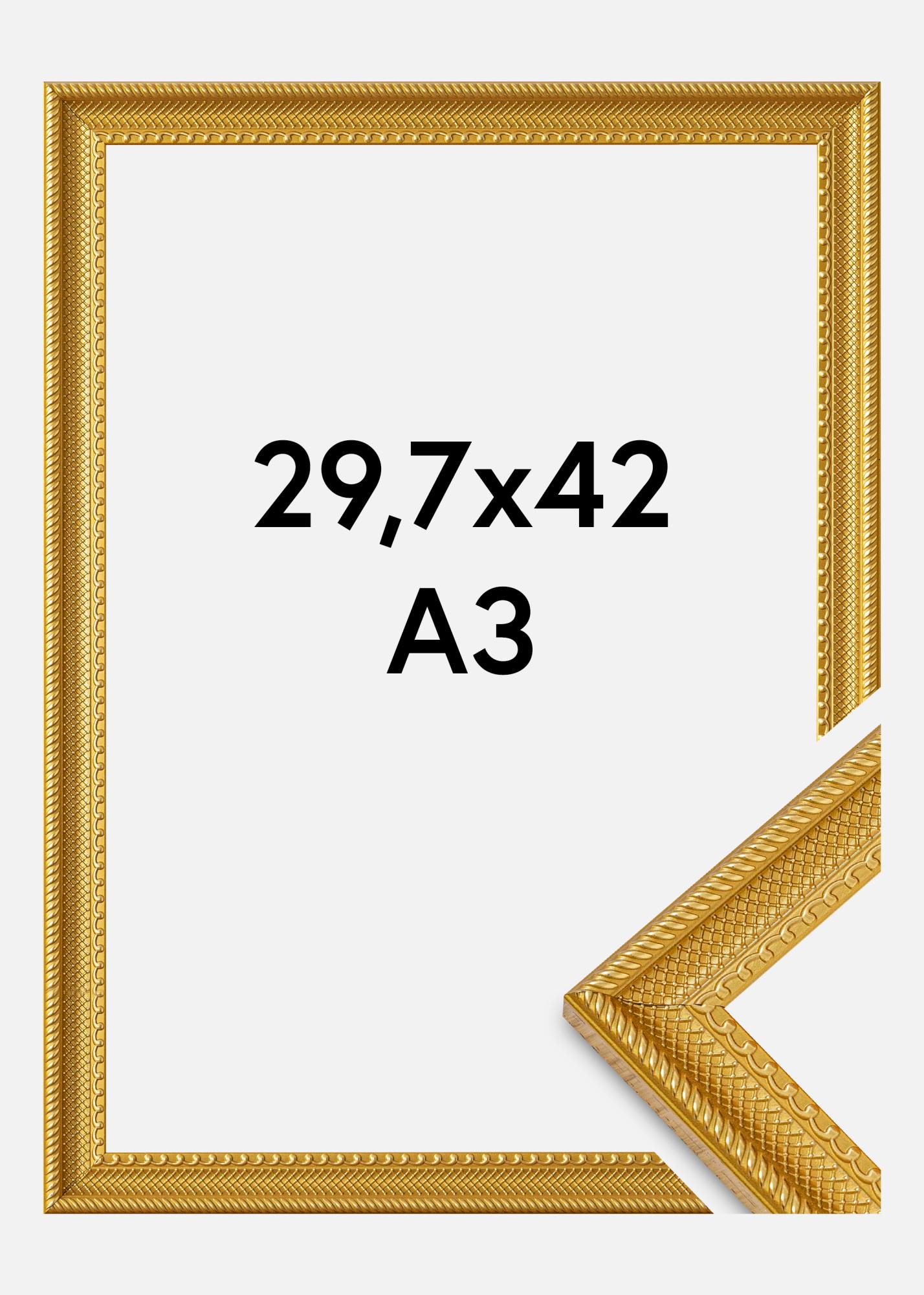 Tämä elegantti kultainen valokuvakehys on täydellinen yhdistelmä klassista muotoilua ja modernia toiminnallisuutta. Yksityiskohtaiset kuviot reunojen pitkin antavat ylellisen tunteen, joka korostaa jokaista taideteosta tai valokuvaa. Kehys on valmistettu komposiittimateriaalista, mikä antaa sille tukevan ja kestävän rakenteen. Se on suunniteltu sopimaan kooltaan 29,7x42 cm (A3) kuviin, mikä tekee siitä ihanteellisen tavan esitellä suosikki muistojasi tyylikkäästi.