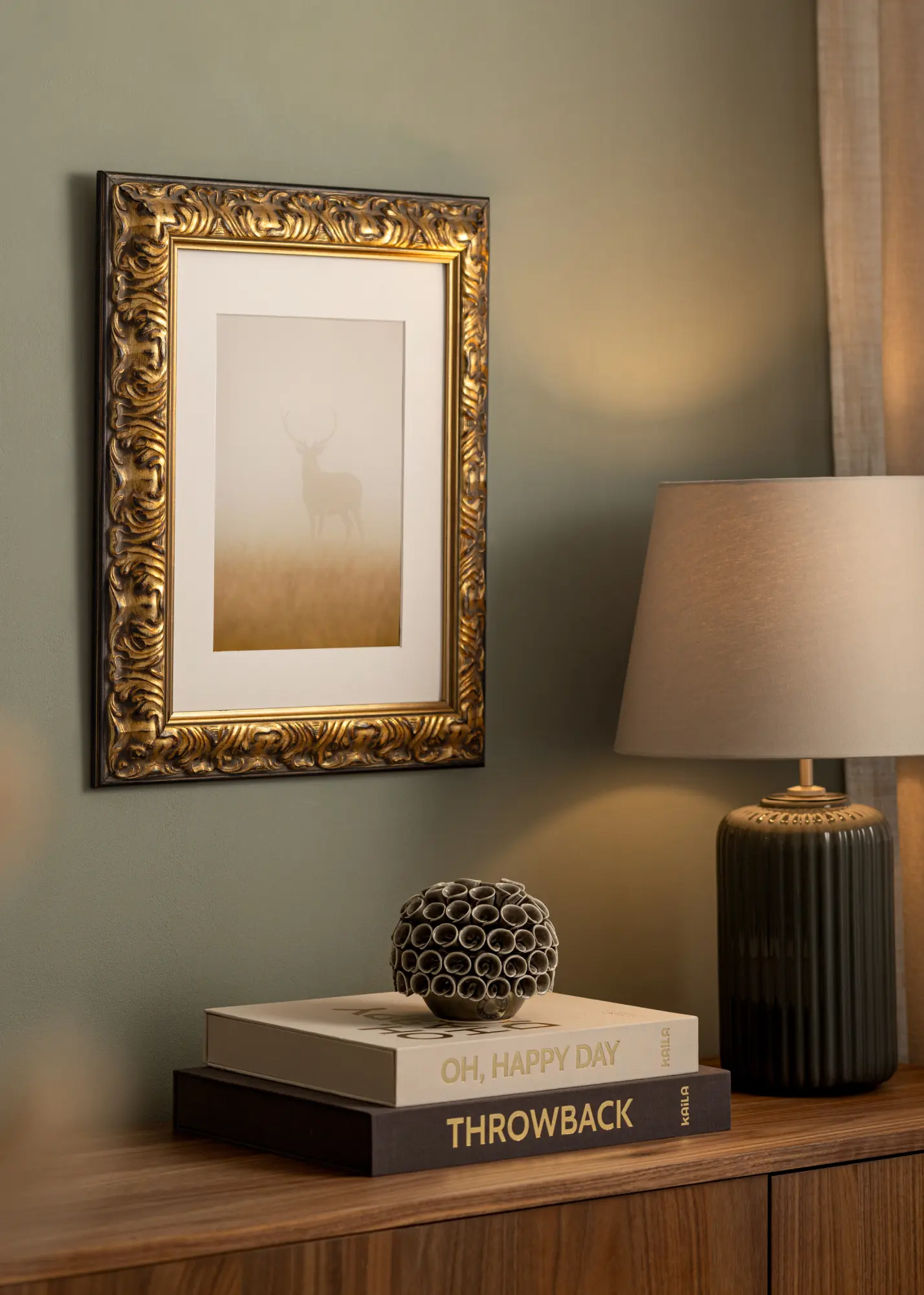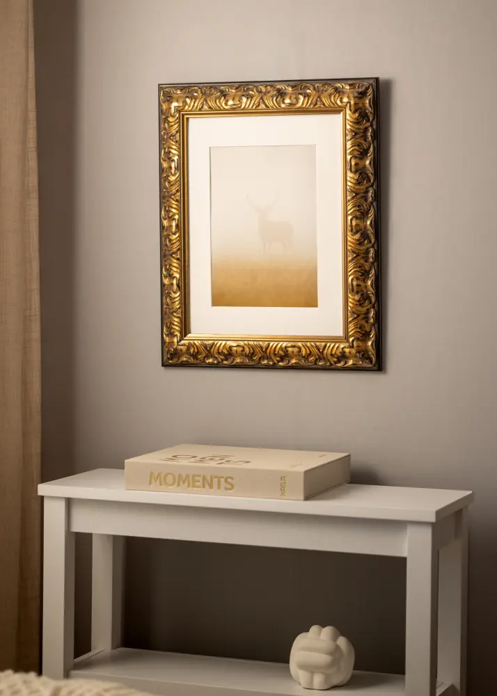 Kehyksessä on kaunis kullanvärinen viimeistely hienovaraisilla mustilla sävyillä, jotka luovat antiikkisen ja hienostuneen tunteen. Koristeellinen muotoilu antaa klassisen ulkonäön, jossa musta tuo syvyyttä ja kontrastia lämpimään kultaan. Tämä tekee siitä ihanteellisen perinteisiin ja tyylikkäisiin kehystyksiin, olipa kyseessä perhemuotokuvat, taideteokset tai muut merkittävät kuvat.