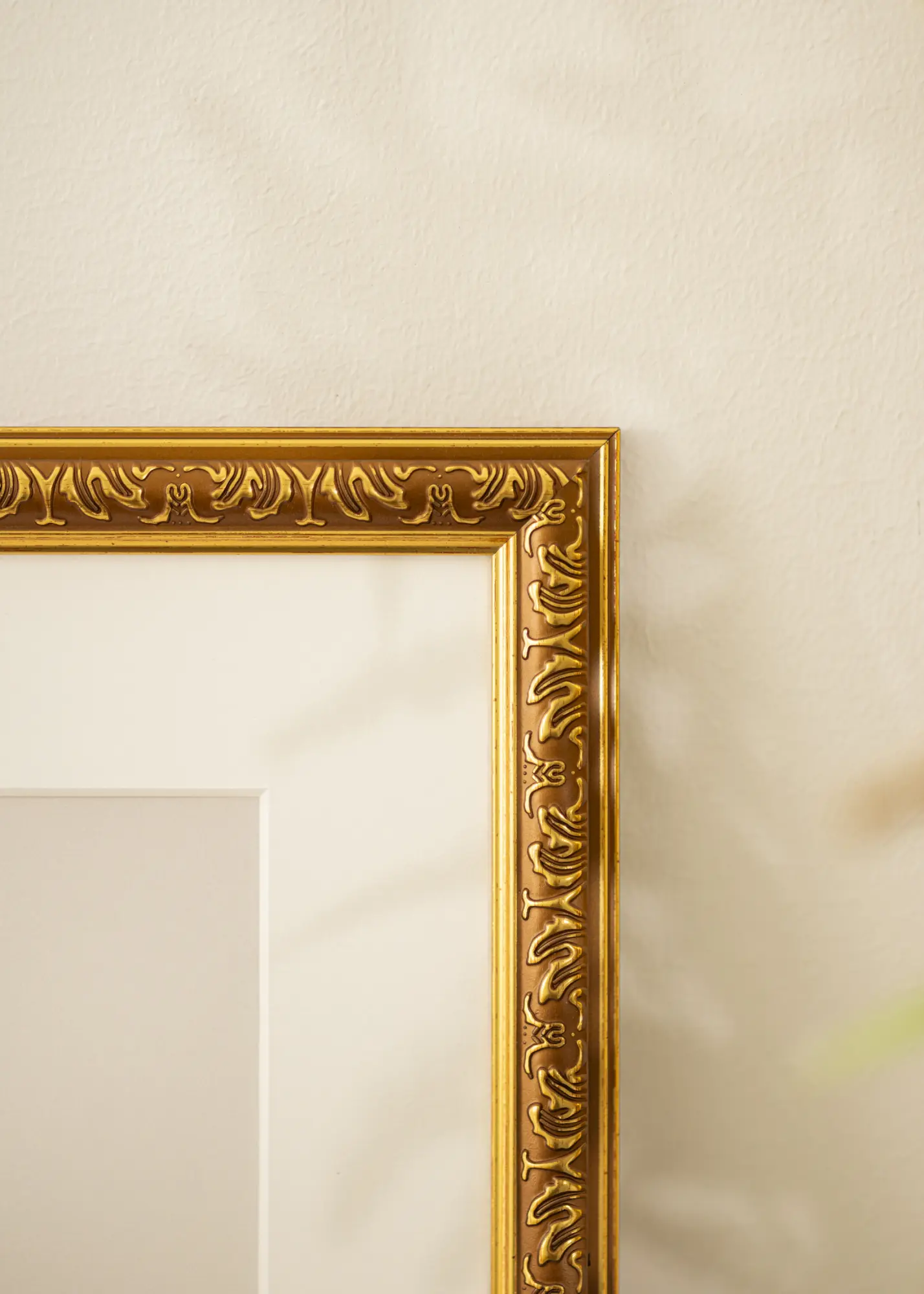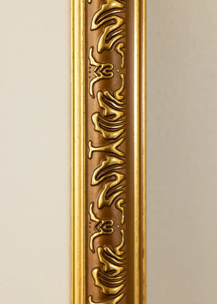 28 mm leveä kultainen kehyksen lista on koristeellisesti koristeltu yksityiskohdilla, jotka antavat perinteisen ja ajattoman tunnun. Sisäreunan monimutkaiset kuviot korostavat sen hienostunutta ulkonäköä, mikä tekee siitä ihanteellisen klassisiin ja tyylikkäisiin sisustustyyleihin. 20 mm syvyys antaa kehykselle vakaan ja tukevan reunustamisen kuvillesi.