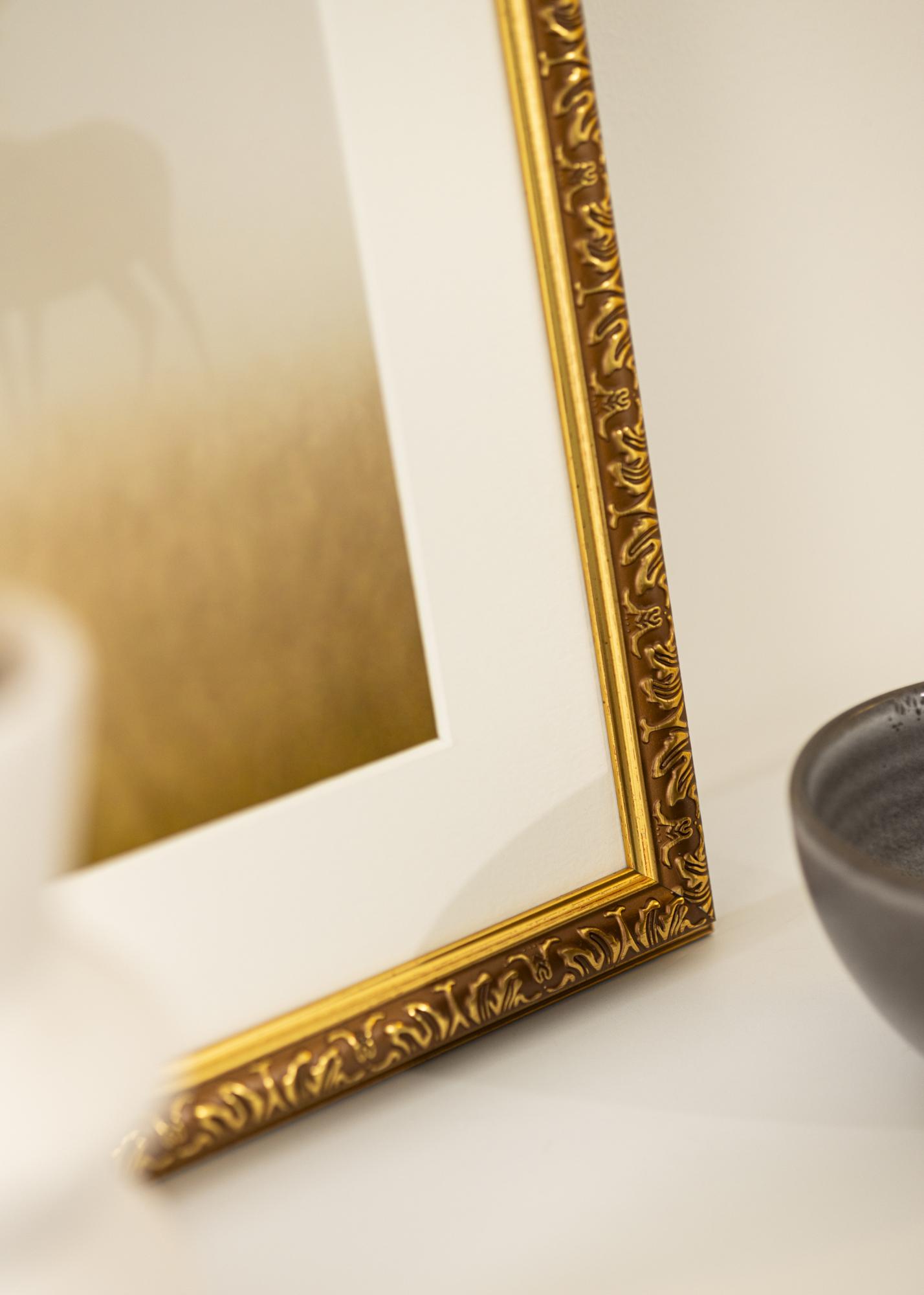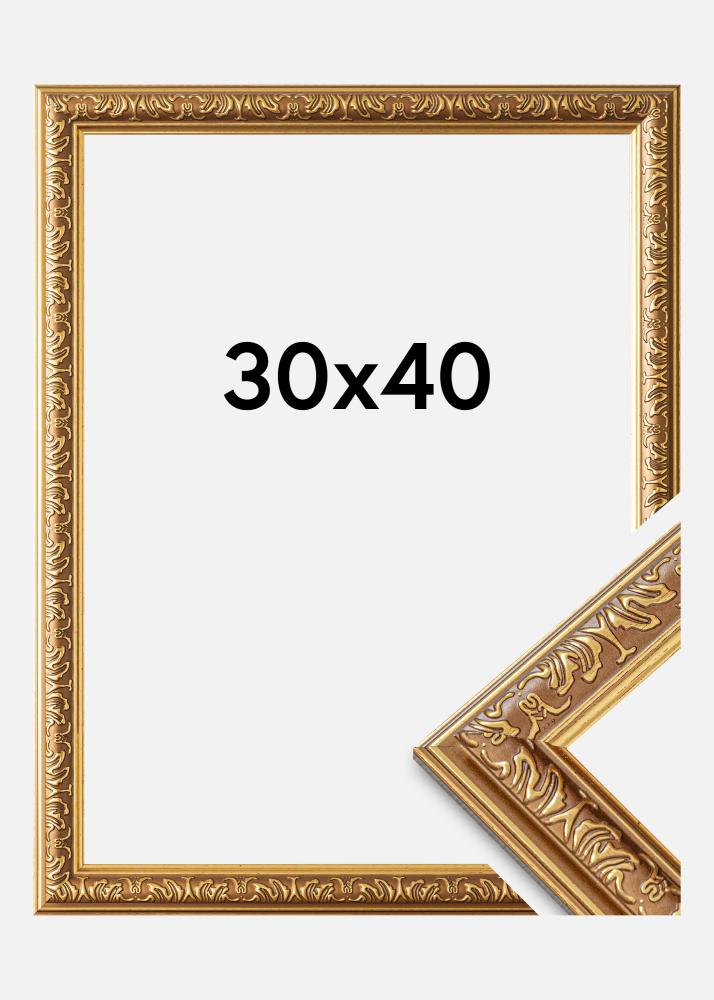Tämä kultainen valokuvakehys on täydellinen yhdistelmä klassista eleganssia ja modernia toimivuutta. Sen 30x40 cm koko on ihanteellinen korostamaan suosikkiaiheitasi, olivatpa ne taideteoksia tai valokuvia. Ylellinen kultapinta ja koristeelliset, koristellut yksityiskohdat kehyksen sisäreunassa antavat hienostuneen kosketuksen, joka sopii erinomaisesti sekä klassisiin että tyylikkäisiin sisustuksiin.