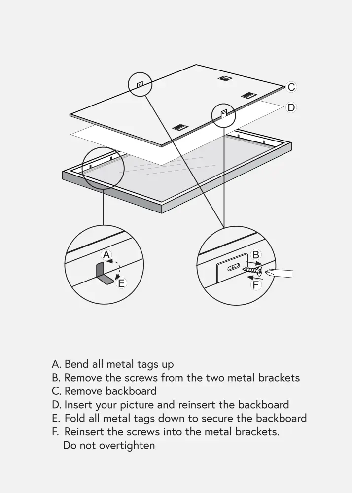 Kehyksessä on metalliripustimet takana sekä vaakasuoraa että pystysuoraa ripustusta varten. Ulkomitta on 43 cm.