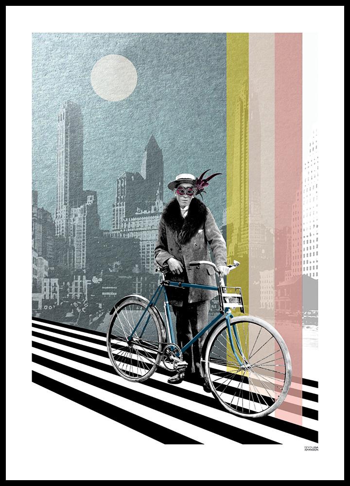 Surrealistinen juliste naamioituneesta pyöräilijästä suurkaupunki taustanaan. Ajatuksia herättävä graafinen kuva, jonka selkeät linjat korostavat kuvan miestä. Kevyesti kehystettynä juliste sopii hyvin sävyttämään seinää. Sopii hyvin yhteen myös muiden, taulun grafiikkaa korostavien taidejulisteiden kanssa.