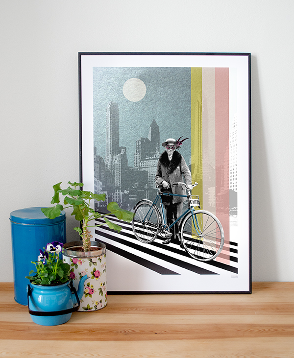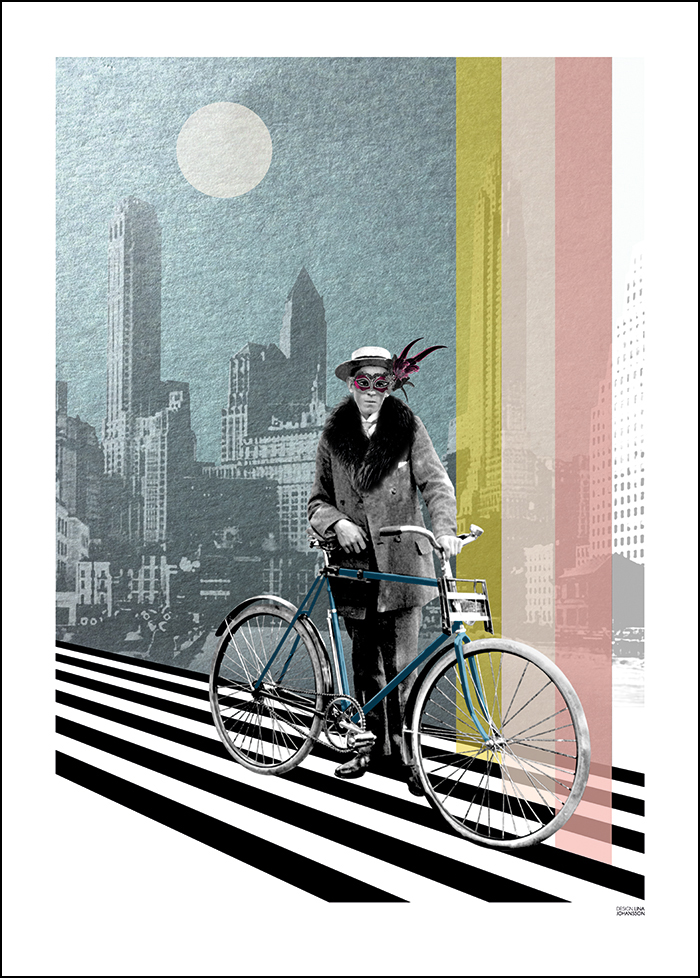 Surrealistinen juliste naamioituneesta pyöräilijästä suurkaupunki taustanaan. Ajatuksia herättävä graafinen kuva, jonka selkeät linjat korostavat kuvan miestä. Kevyesti kehystettynä juliste sopii hyvin sävyttämään seinää. Sopii hyvin yhteen myös muiden, taulun grafiikkaa korostavien taidejulisteiden kanssa. Tekstiilisuunnittelija ja graafinen muotoilija Lina Johansson johtaa omaa, vahvojen värien ja muotojen sävyttämää kodinsisustus- tuotemerkkiään jo vuodesta 2012. Tiukasti, riisutusti ja perinteisesti Pohjoismaiseen muotokieleen sekoittuvat leikkisämmät piirteet. Muotoilu tapahtuu ajatuksella ja tunteella, materiaalit ja tuottajat valitaan huolella. Kehykset eivät sisälly toimitukseen, mutta ne voidaan tilata kuvan lisäksi.