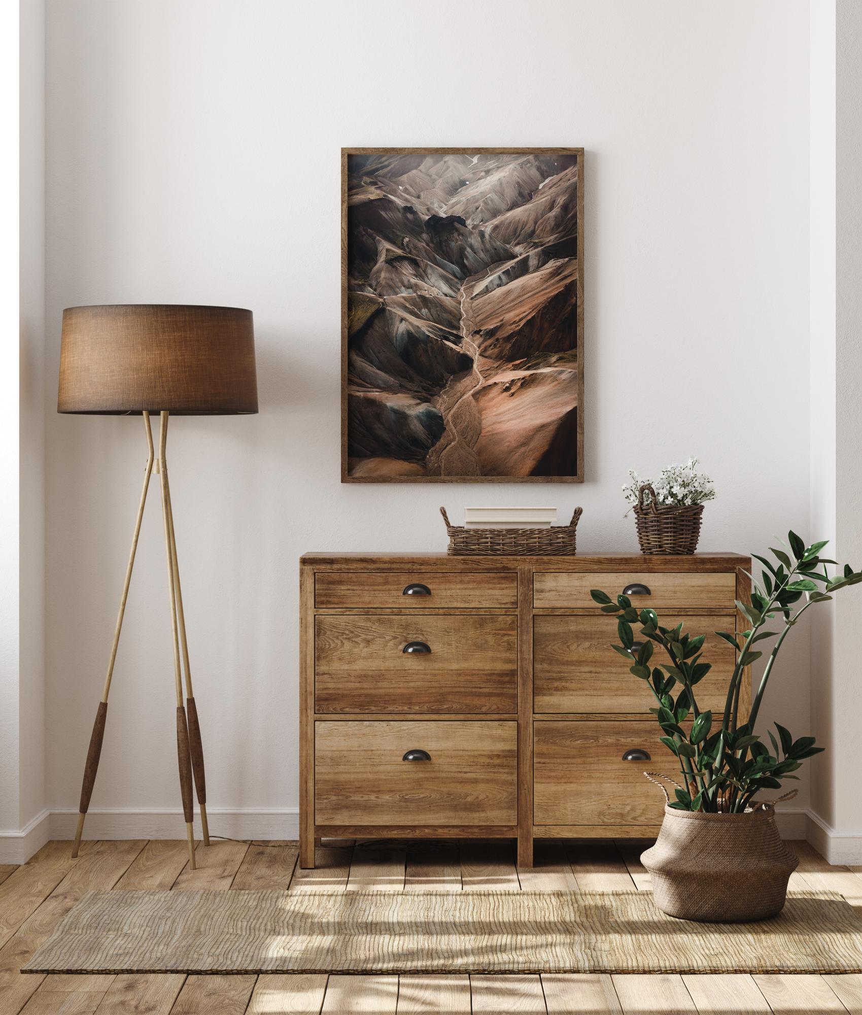 Näyttävä ilmakuvajuliste vuorista, jossa näkyvät värikkäät Ryholite-vuoret. Pehmeät syksyn ruskean sävyt luovat lämpöä, joten tämä on inspiroiva kuva ripustettavaksi kotiisi. Seuraa yksittäistä polkua ja katso, minne se vie sinut tällä kauniilla luontopolulla.