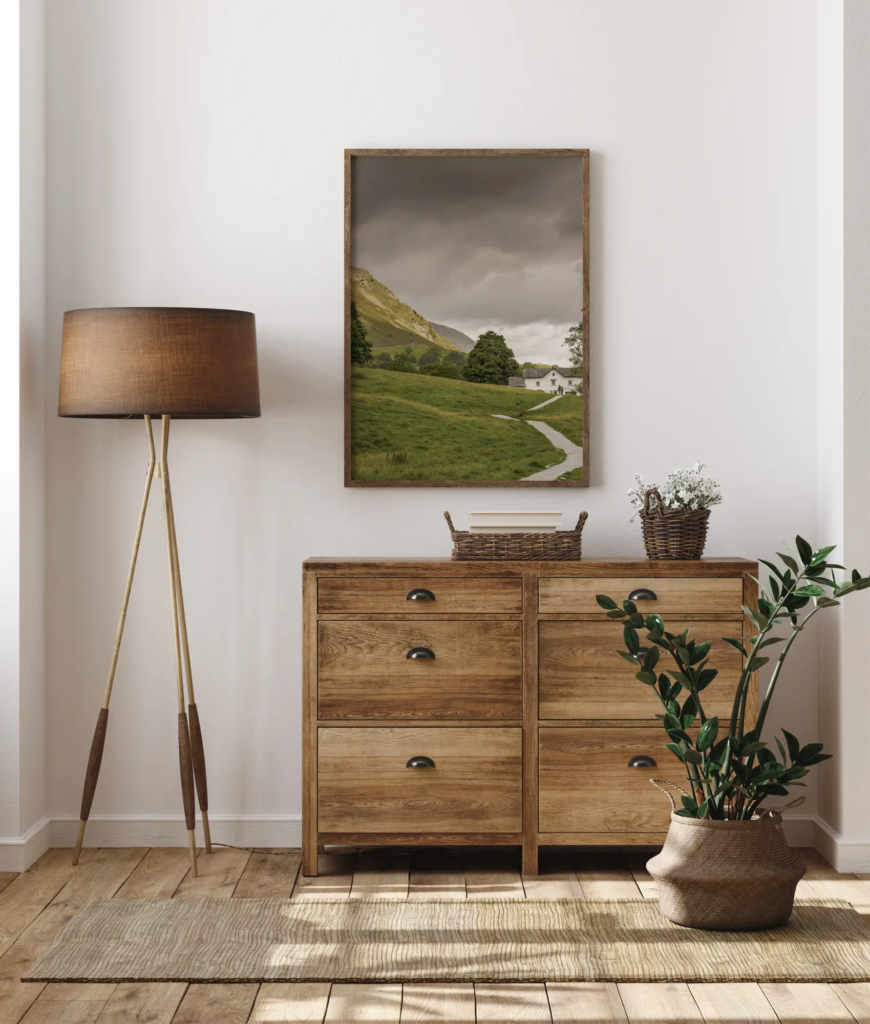 Tunnelmallinen juliste suuresta valkoisesta maalaistalosta, joka sijaitsee valkoisen polun päässä. Pilvinen taivas luo tumman mutta kauniin tunnelman. Tunne rauhallisuus tässä maaseutukuvassa ja arvosta kaunista luontoa tässä kuvassa.