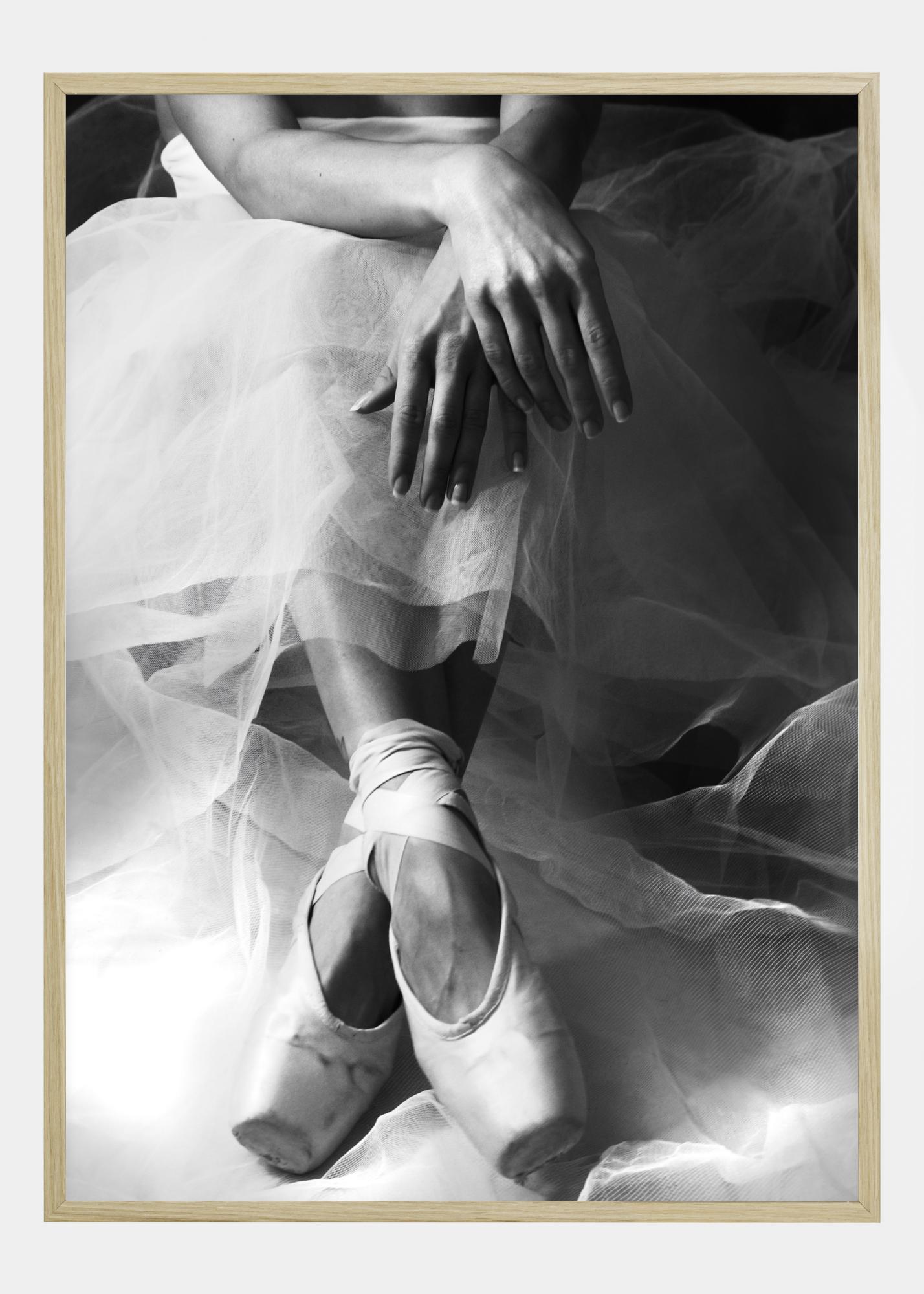 Tyylikäs juliste balleriinasta, joka poseeraa ennen tanssia. Seuraa ristissä olevia jalkoja ja käsiä, kun hän odottaa vuoroaan. Tämä juliste on täydellinen lisä neutraalille seinälle.
