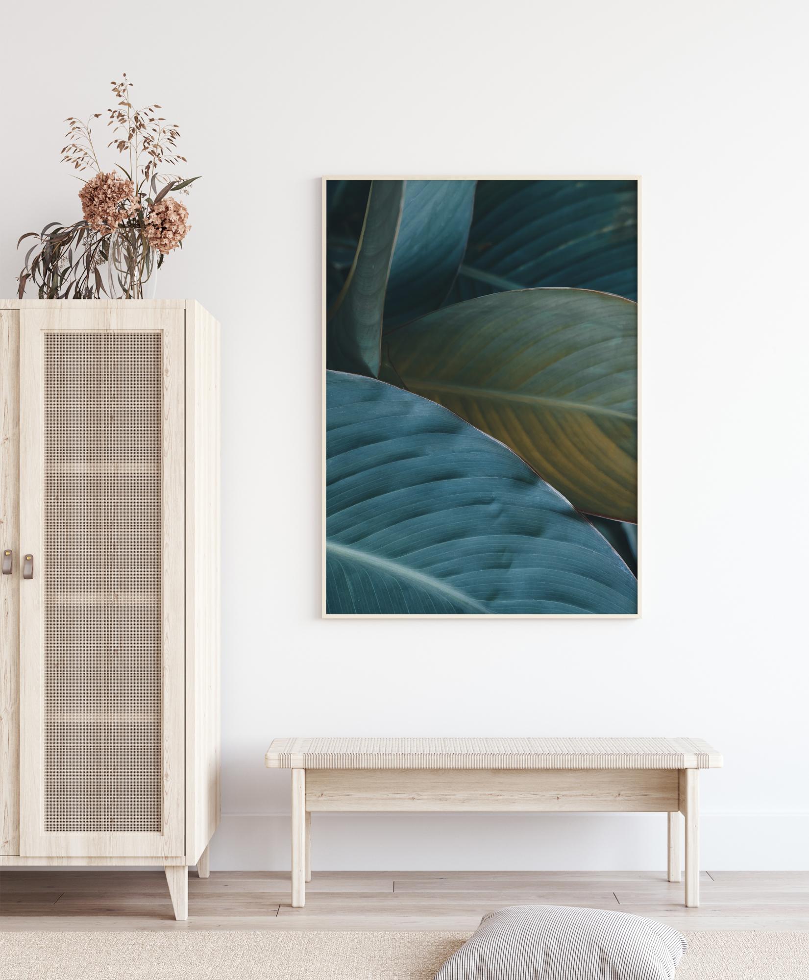 Lähikuvapainatus lehdistä. Tämän julisteen yksinkertaisuus näkyy vihreän eri sävyissä. Lehdet ovat vaaleampia keskiosaa kohti. Luonnonvalo paistaa reunoihin, mikä antaa lehdelle kullanvärisen ilmeen. Kaunis juliste ripustettavaksi huoneeseen, joka on täynnä kasveja.