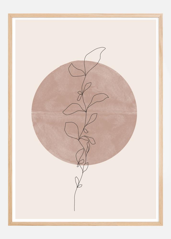 Tämä juliste esittää herkän viivapiirroksen kukkivasta oksasta, jonka ääriviivat leikkivät suurta maalattua ympyrää vasten rauhoittavassa, maanläheisessä sävyssä. Minimalistisen kukka-aiheen ja voimakkaan taustavärin välinen kontrasti luo kiinnostavan dynamiikan, joka on sekä rauhoittava että esteettisesti miellyttävä.