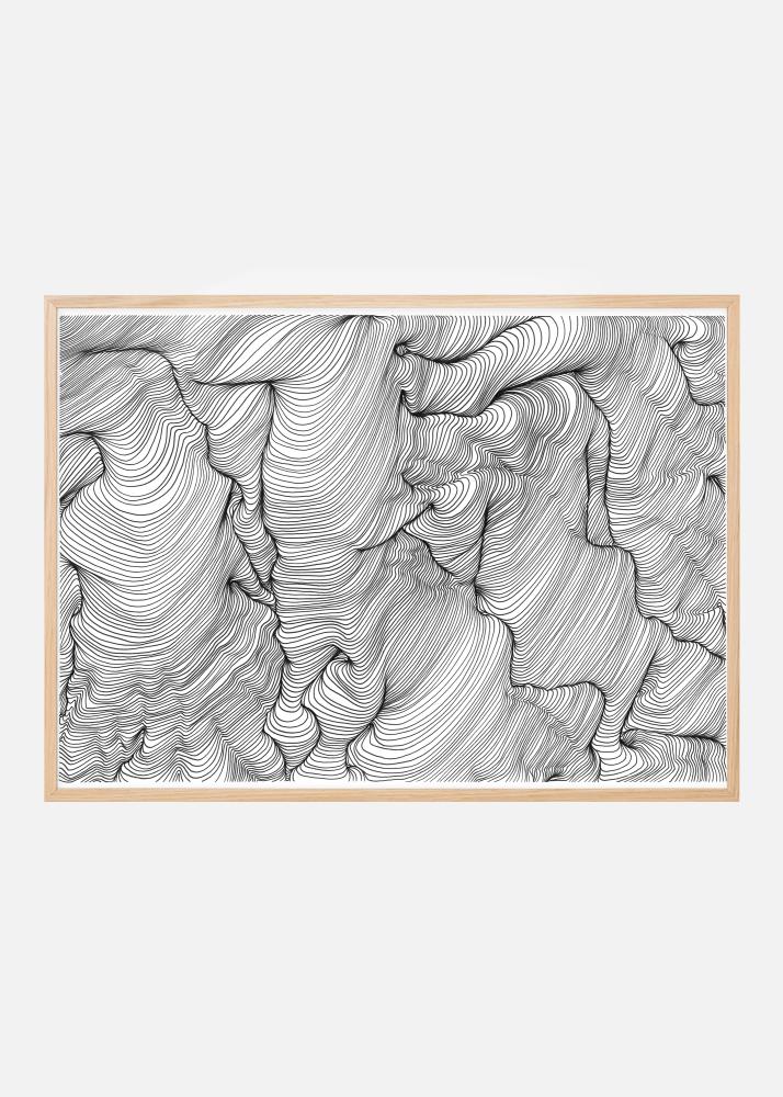 Abstrakti taidejuliste mustalla musteella, aaltoilevilla viivoilla, jotka luovat jännittäviä muotoja, luonut Belinda Hellberg, Hells Bells Sthlm. Aiheen ympärillä on hieman ohuempi valkoinen passepartout, joka tehokkaasti korostaa sen sisältöä. Yksinkertainen ja tyylikäs juliste, joka on helppo yhdistää muiden suosikkien kanssa suuremmalla tauluseinällä.