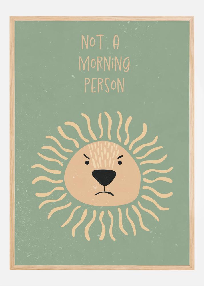 Leikkisällä ilmaisulla ja viehättävällä viestillä tämä juliste on hauska sisustusyksityiskohta kaikille, jotka eivät ole aamuvirkkuja. Kuvitus esittää suloisen leijonan, jonka kampaus muistuttaa auringonsäteitä, ja siihen liittyy teksti "NOT A MORNING PERSON" rennossa, käsin kirjoitetussa tyylissä. Taustan hillitty vihertävä sävy luo rauhoittavan vaikutelman, kun taas leijonan lämpimät keltaiset ja beiget sävyt luovat pehmeän ja kutsuvan tunnelman.