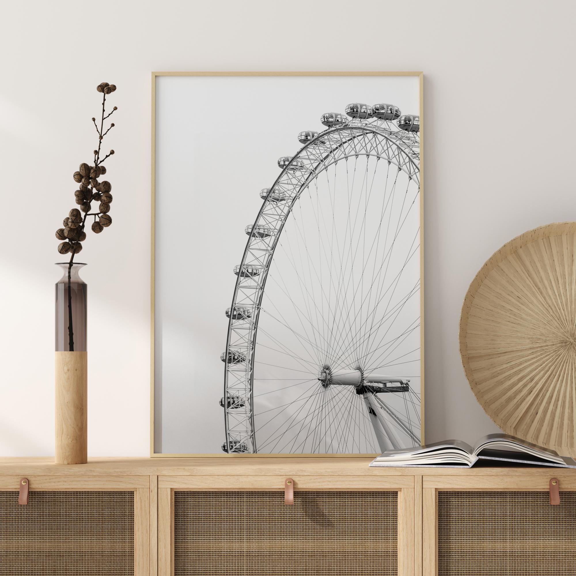 Henkeäsalpaava vedos London Eye -näköalapyörästä. Harmaan taivaanrannan kanssa London Eyen mustat kehykset vievät katseesi näköalapyörän reunalla istuviin matkustajahytteihin. Vaikuttava painatus, joka korostaa näköalapyörän kokoa. Kaunis painatus, joka luo valtavuuden tunteen.
