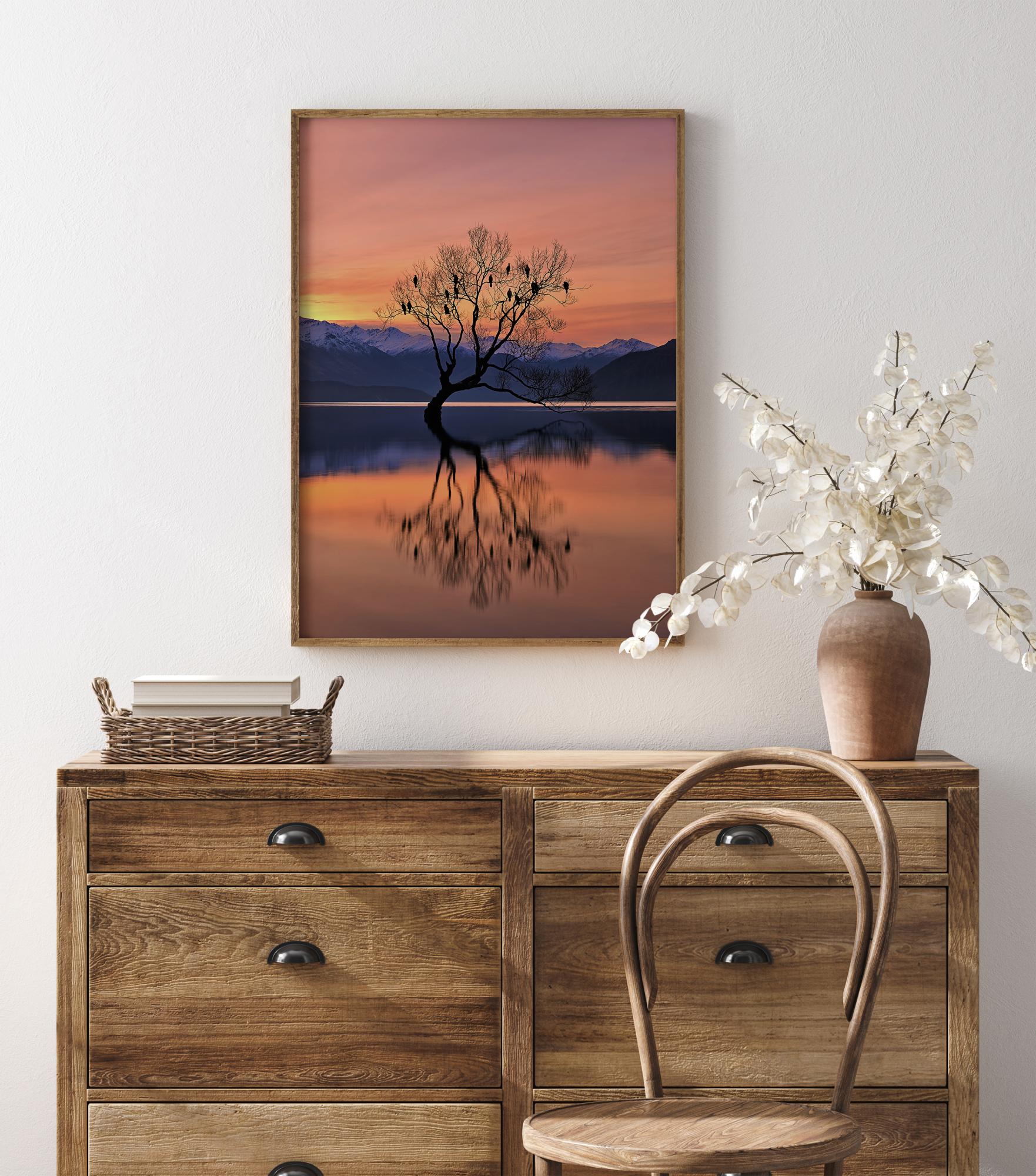Kaunis luontojuliste yksinäisestä puusta järven keskellä. Tämä pastellivärinen juliste, jossa on puu, ja jonka oksilla istuu rauhallisesti lintuja, heijastaa puun järveen ja luo täydellisen peiliefektin sekä luonnosta että väreistä. Kuule hiljaisuus tässä rauhoittavassa vedoksessa.