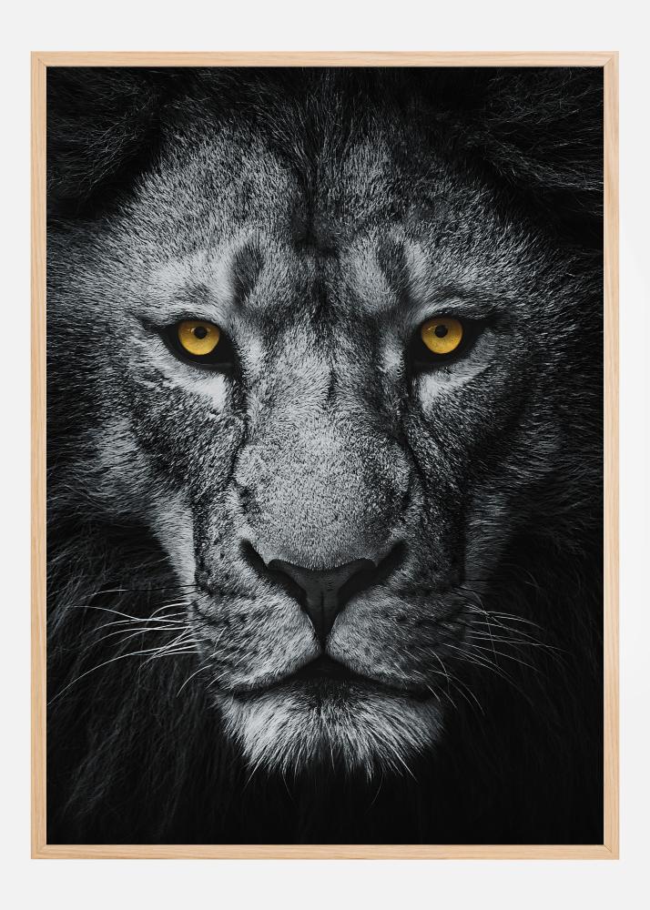 Tämä rohkea ja sugestiivinen juliste kuvaa leijonan muotokuvan vaikuttavalla yksityiskohtaisuudella. Kuva on mustavalkoinen, lukuun ottamatta leijonan silmiä, jotka loistavat voimakkaassa ja eloisassa keltaisessa sävyssä, luoden vastustamattoman keskipisteen kuva-aiheeseen. Harkittu värin ja kontrastin käyttö antaa voimakkuuden ja läsnäolon tunteen, joka vangitsee ja pitää katsojan huomion. Tämä juliste on täydellinen, jos haluat sisustukseesi villin ja luonnollisen voiman tuntua.