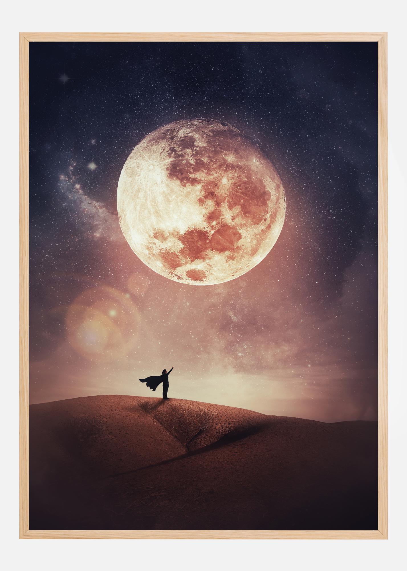 Tämä unenomaiselta vaikuttava juliste vangitsee maagisen hetken, jossa yksinäinen hahmo seisoo aavikkokukkulalla ja katsoo ylös kohti valtavaa, säteilevää kuuta, jota ympäröi tähtipeitteinen taivas. Kohtaus on vahva muistutus asemastamme universumissa, sekä vähäpätöinen että ihmeellinen. Se herättää tunteita kaipuusta ja uteliaisuudesta, inspiroi meitä ajattelemaan suuria ja unelmoimaan ilman rajoja.