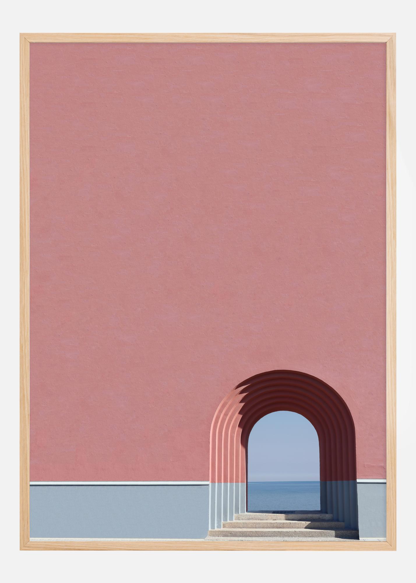 Tämä "Look the Ocean" niminen juliste kutsuu mietiskelyyn yksinkertaisella ja selkeällä suunnittelullaan. Kuva korostaa rauhallista arkkitehtonista kaarta, joka avautuu loputtomaan horisonttiin merelle. Aihe leikkii kontrastilla seinän pehmeän vaaleanpunaisen sävyn ja rauhallisen sinisen meren välillä, luoden rauhallisen ja harmonisen tunteen.