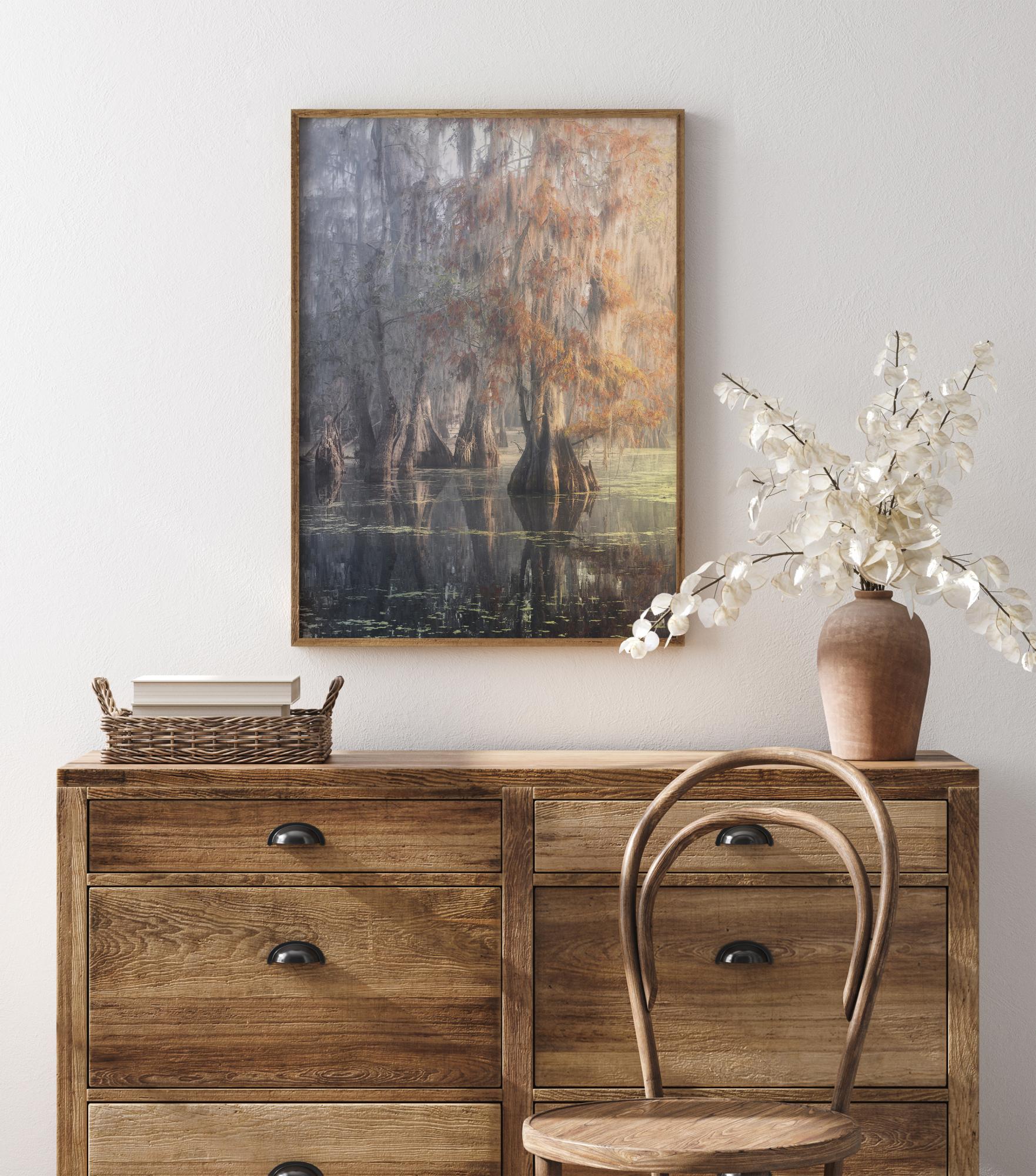 Henkeäsalpaava kuva Louisianan suosta. Poikkeuksellisen rauhallinen kuva tyynen veden suosta. Luonnonvalo heittää suolle täydellisiä heijastuksia, jotka luovat rauhallisuuden tunteen. Tuo luonto kotiisi tämän vedoksen kauniilla vihreän ja ruskean sävyillä.