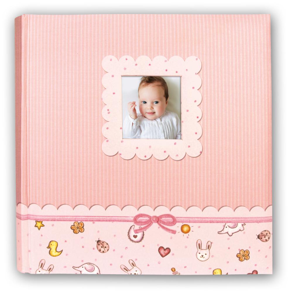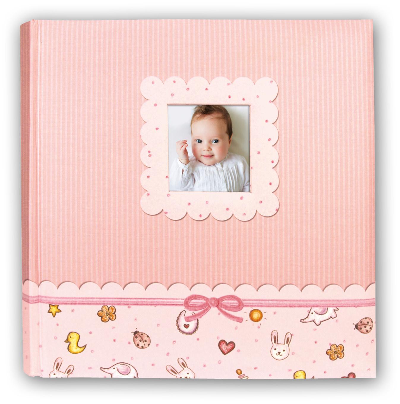 Herttainen, vaaleanpunainen vauva-albumi, jonka kannessa on tila omalle kuvalle. Albumin raidallisten kansien alareuna on täynnä pieniä, suloisia symboleja.