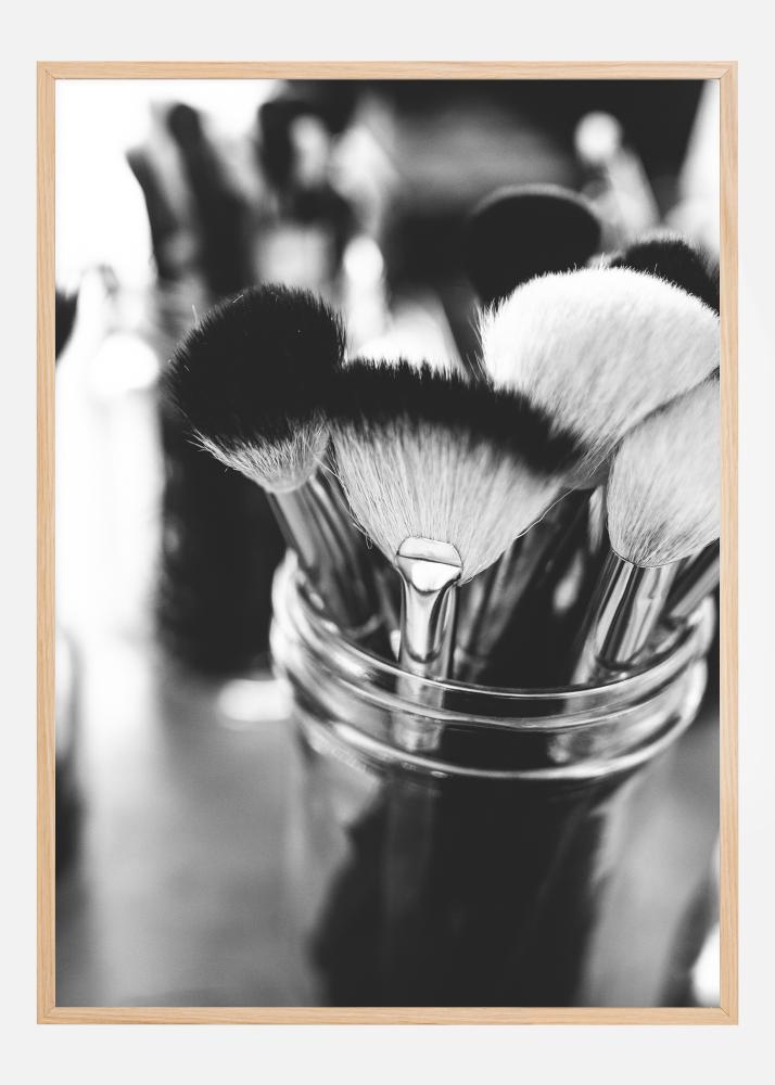 Taiteellinen mutta hauska painatus lasipurkista, joka on täynnä meikkisiveltimiä. Tässä silmiinpistävässä mustavalkoisessa kuvassa näkyy erilaisia sivellinkokoja. Tunne näiden siveltimien pehmeys, kun ripustat tämän vedoksen makuuhuoneesi seinälle.