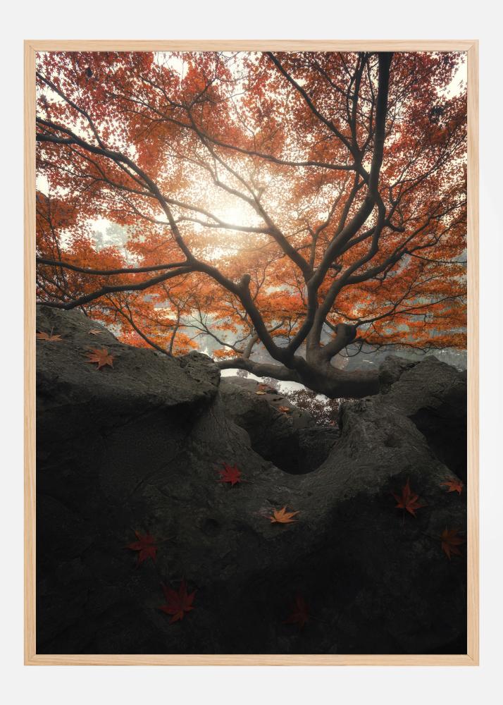 Henkeäsalpaava luontopainatus kauniista, oranssin värisestä vaahterasta. Alhaalta ylöspäin otetussa kuvassa kirkas auringonvalo säteilee oksien läpi luoden lämpimän rentouttavan tunnelman. Etualalla yksittäiset punaiset ja oranssit lehdet ovat pudonneet rungon päälle. Lisää ripaus luontoa tällä teoksella kotiisi.