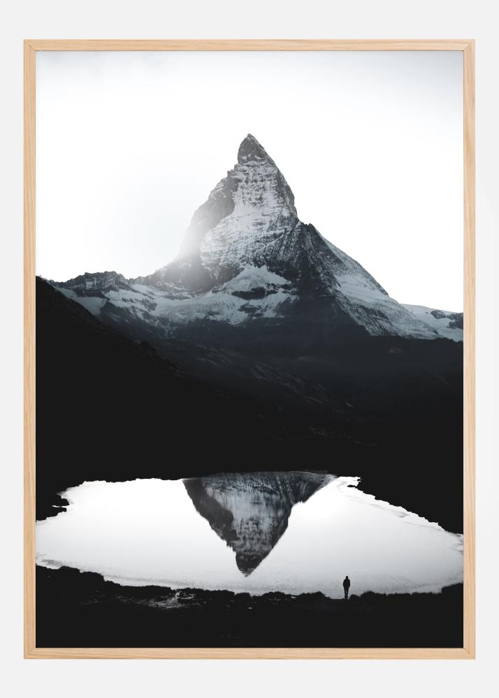 Tässä upeassa mustavalkokuvassa Matterhornin huippu lävistää aamutaivaan. Auringon säteet pimentävät vuoren rosoisen rinteen miehen tuijottaessa sitä. Kohtauksen heijastus on vangittu kuvan alareunassa olevaan järveen. Kuule hiljaisuus, kun ripustat tämän vedoksen olohuoneeseesi.