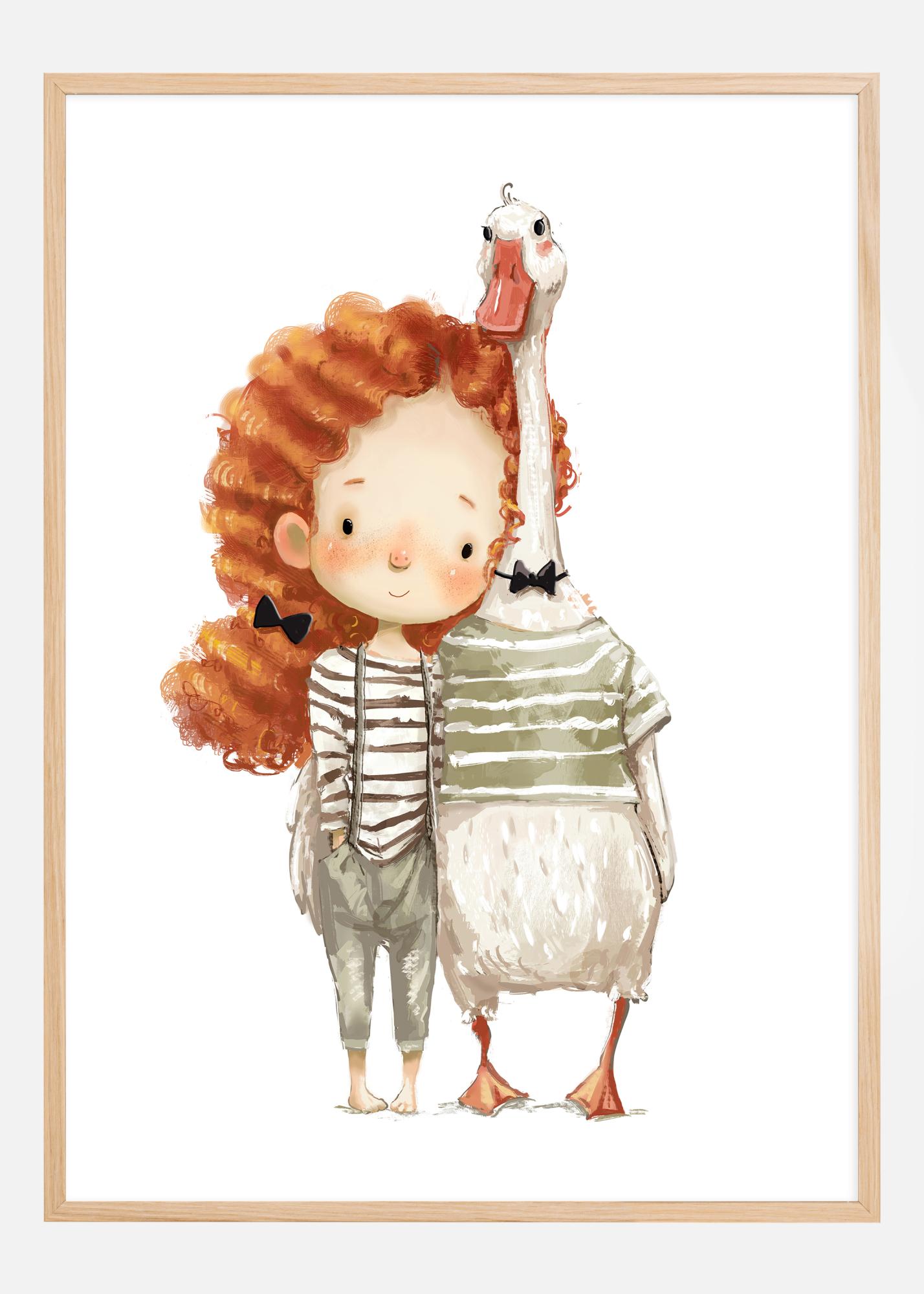 Tämä leikkisä ja sydämellinen juliste kuvaa nuorta tyttöä, jolla on elinvoimaiset, punaiset kiharat, seisten hänen uskollisen seuralaisensa, suuren ankan vieressä. He jakavat hellän ja iloisen hetken yhdessä, mikä on vangittu akvarellimaalauksen pehmeissä, lämpimissä sävyissä. Hurmaava kaksikko, tytön vaaleanpunaisine poskineen ja ankan uteliaine katseineen, huokuu ystävyyttä ja iloa.