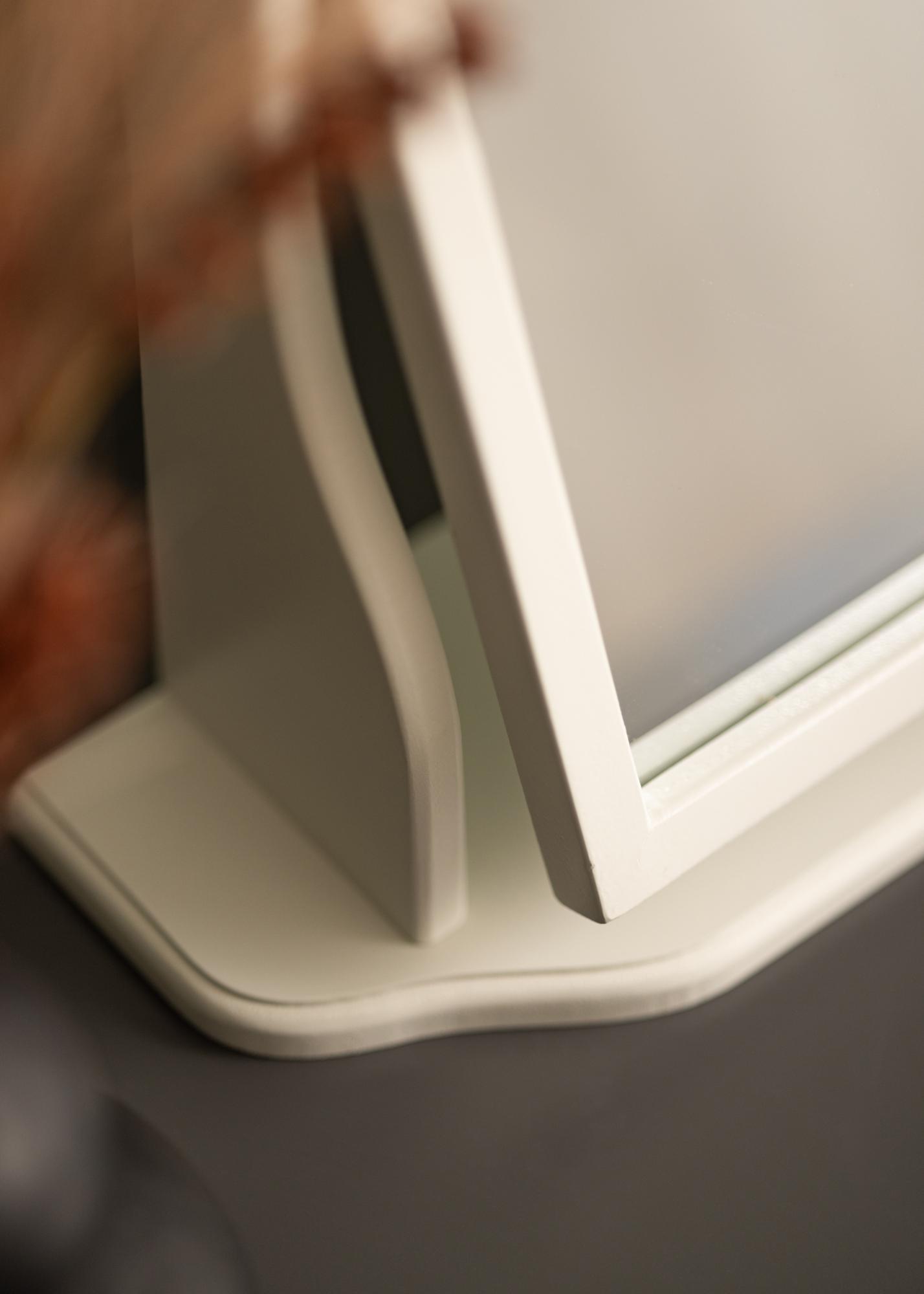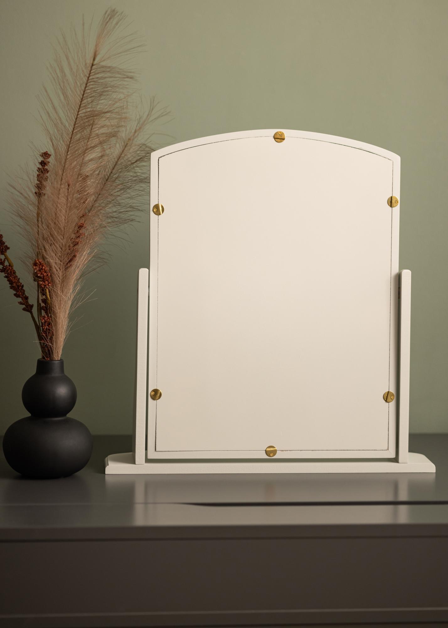 Tämä peili on suunniteltu harmaalla kehyksellä, joka antaa huoneelle hienostuneen ja hienostuneen ilmeen. Se seisoo vakaasti tukevalla jalustallaan, mikä tekee siitä ihanteellisen käytettäväksi pöydällä tai lipaston päällä valmistautuessasi päivään tai iltaan.