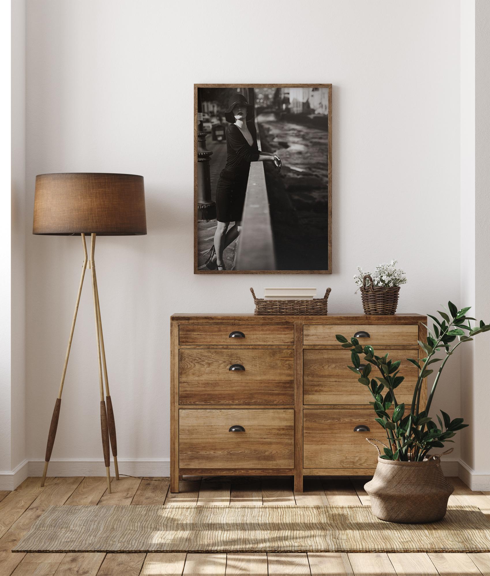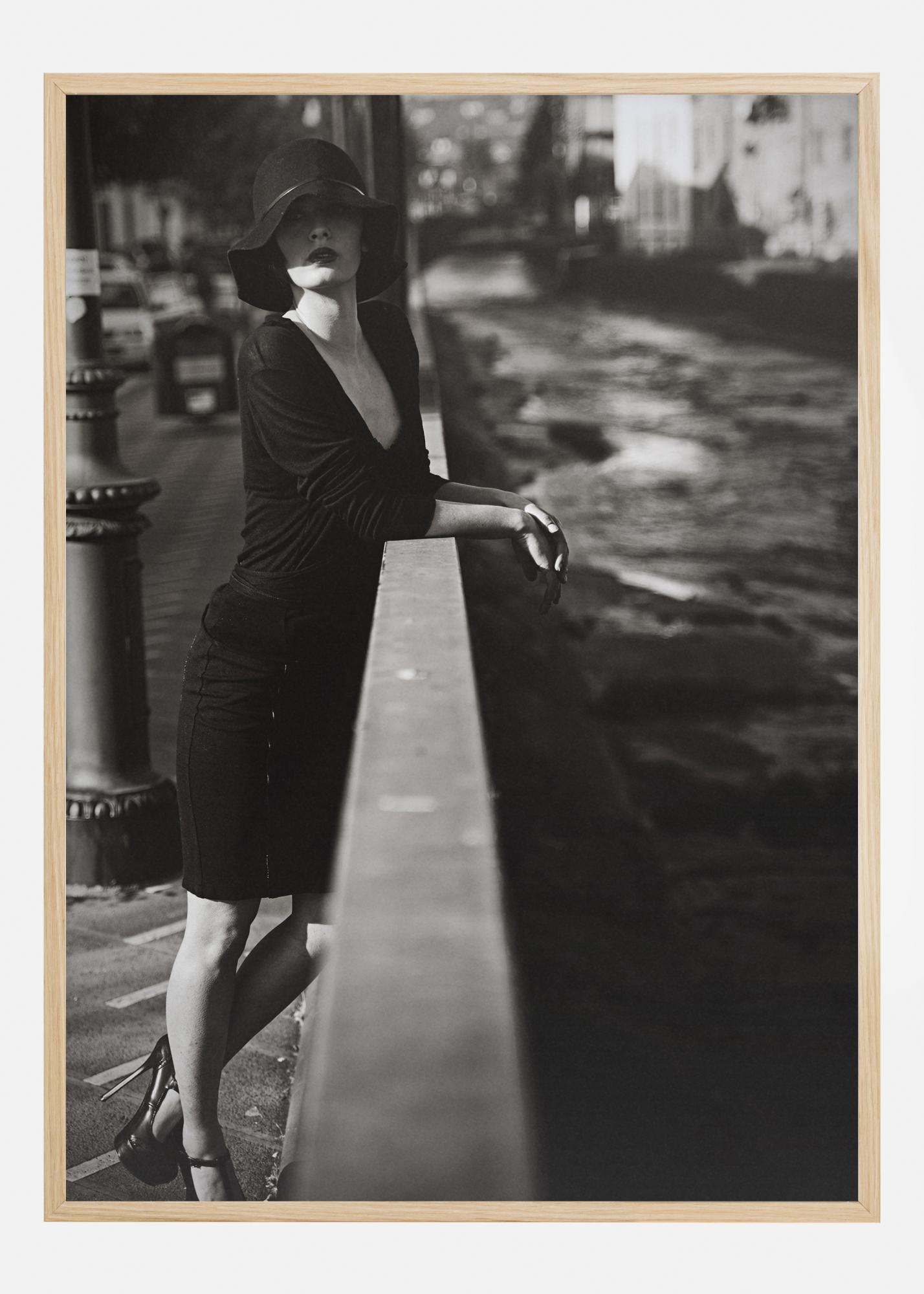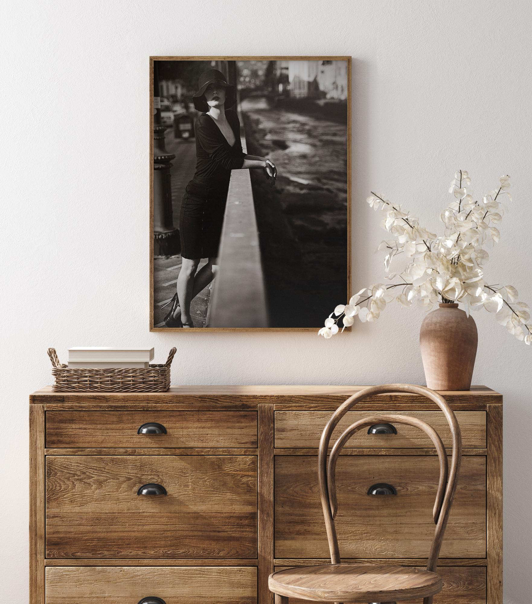 Muotokuva seinään nojaavasta naisesta. Tämä upea valokuva huokuu tyyliä ja tyylikkyyttä ja vangitsee rennon tyylikkyyden kuin mikään muu. Lisää tämä seinällesi 30-luvun chilliä tunnelmaa varten.
