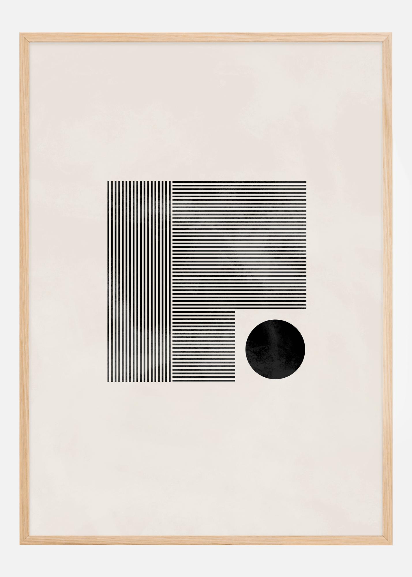 Tämä tyylikäs ja minimalistinen juliste esittää geometrisen leikin suorakulmioiden ja ympyrän välillä, kaikki kuvattuina rohkeilla mustilla viivoilla ja muodoilla pehmeää, kermaista taustaa vasten. Suorakulmioiden viivojen tiukka sommittelu antaa tunteen järjestyksestä ja rakenteesta, kun taas yksinäinen musta ympyrä rikkoo kaavaa ja tuo mukanaan epäsäännöllisyyttä, joka luo visuaalista kiinnostusta ja tasapainoa. Tämä on taideteos, joka voidaan arvostaa sen yksinkertaisuuden ja kyvyn täydentää monenlaisia sisustustyylejä.