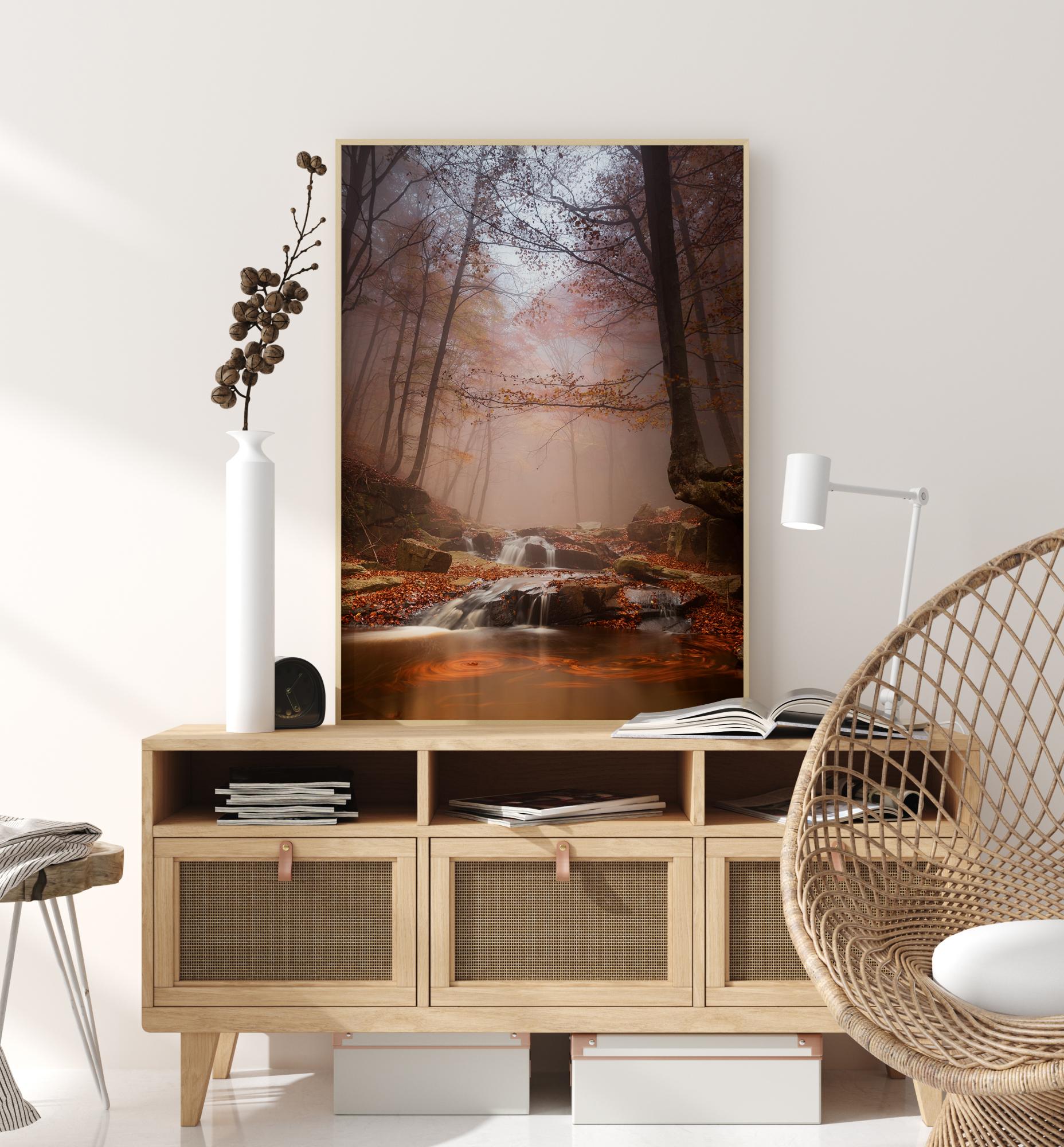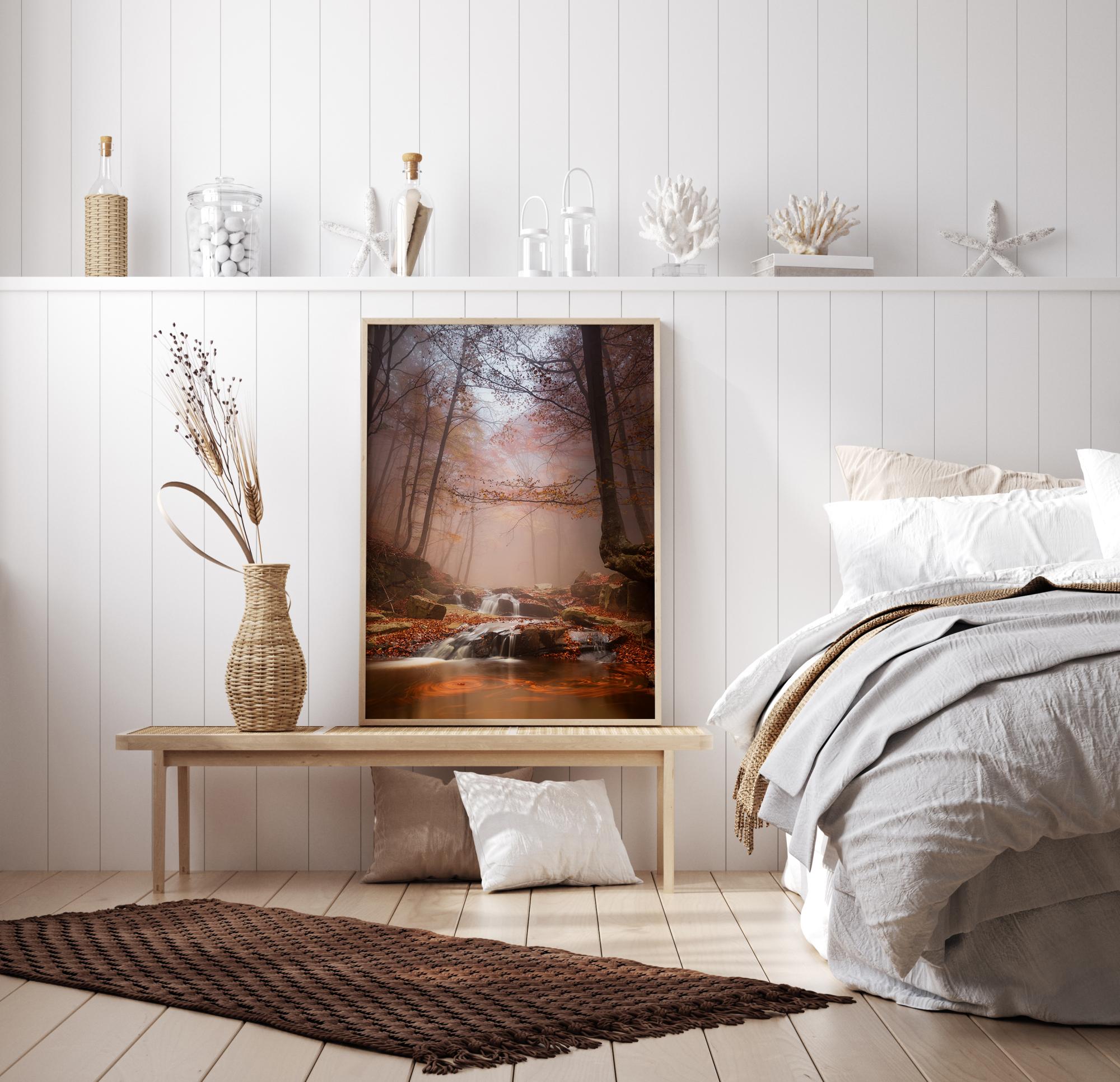 Maisemallinen muotokuva sumuisesta metsästä ja kauniista purosta. Sumu estää suoran auringonvalon ja vain jotkut säteet valaisevat savuista metsää korostaen ruskeita ja keltaisia lehtiä. Etualalla syksyn väriset lehdet lojuvat joen rannalla. Kuva antaa kotiisi maisemallisen, kivisen ja mäkisen metsänäkymän.