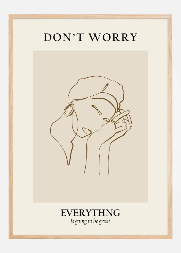 Tämä taiteellinen juliste vangitsee rauhallisen hetken pohdintaa ja sisäistä rauhaa piirroskuvalla henkilöstä, joka pitää kättään kasvoillaan. Teksti "DON'T WORRY" suurilla kirjaimilla on kuvan yläpuolella, tarjoten rauhoittavan muistutuksen, kun taas "EVERYTHING is going to be great" korostaa viestiä harkitsevammalla sävyllä. Tämä moderni taideteos on täydellinen tuomaan kodin tai toimiston sisustukseen rauhallisuutta ja optimismia.