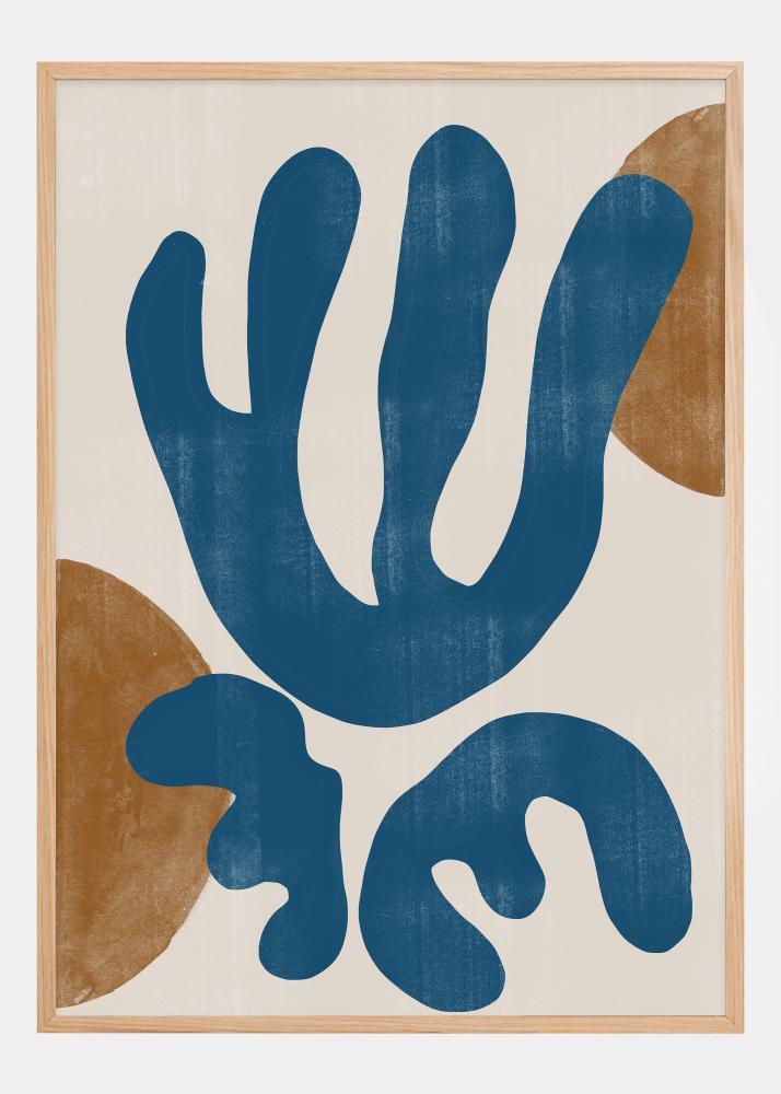 Tämä eläväinen juliste yhdistää rohkeat muodot ja maanläheisen väripaletin luodakseen tunteen sekä modernista taiteesta että luonnon ihmeistä. Suuret, kaarevat siniset muodot herättävät ajatuksia vedestä tai kasvillisuudesta, kun taas okran yksityiskohdat tuovat lämpimän ja luonnollisen kontrastin. Tämä muotoilu on erinomainen esimerkki siitä, miten abstrakti taide voi jäljitellä ja ylistää ympäröivän maailmamme orgaanisia kuvioita.