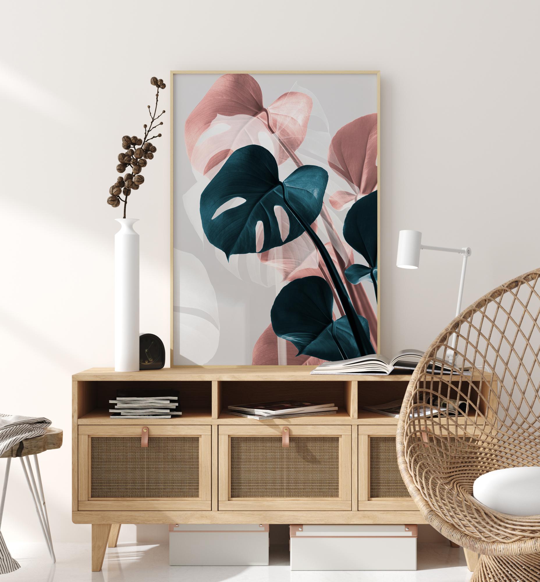 Kaunis kuva vaaleanpunaisista ja tummanvihreistä jättipeikonlehdistä, jotka osoittavat virheettömän luovuuden lehdissään. Beigenväriselle taustalle asetetut sydämenmuotoiset vihreät ja vaaleanpunaiset lehdet loistavat kauniisti. Sulkasuoniset rakenteet tuovat ja jännittävää tunnelmaa kotiisi.
