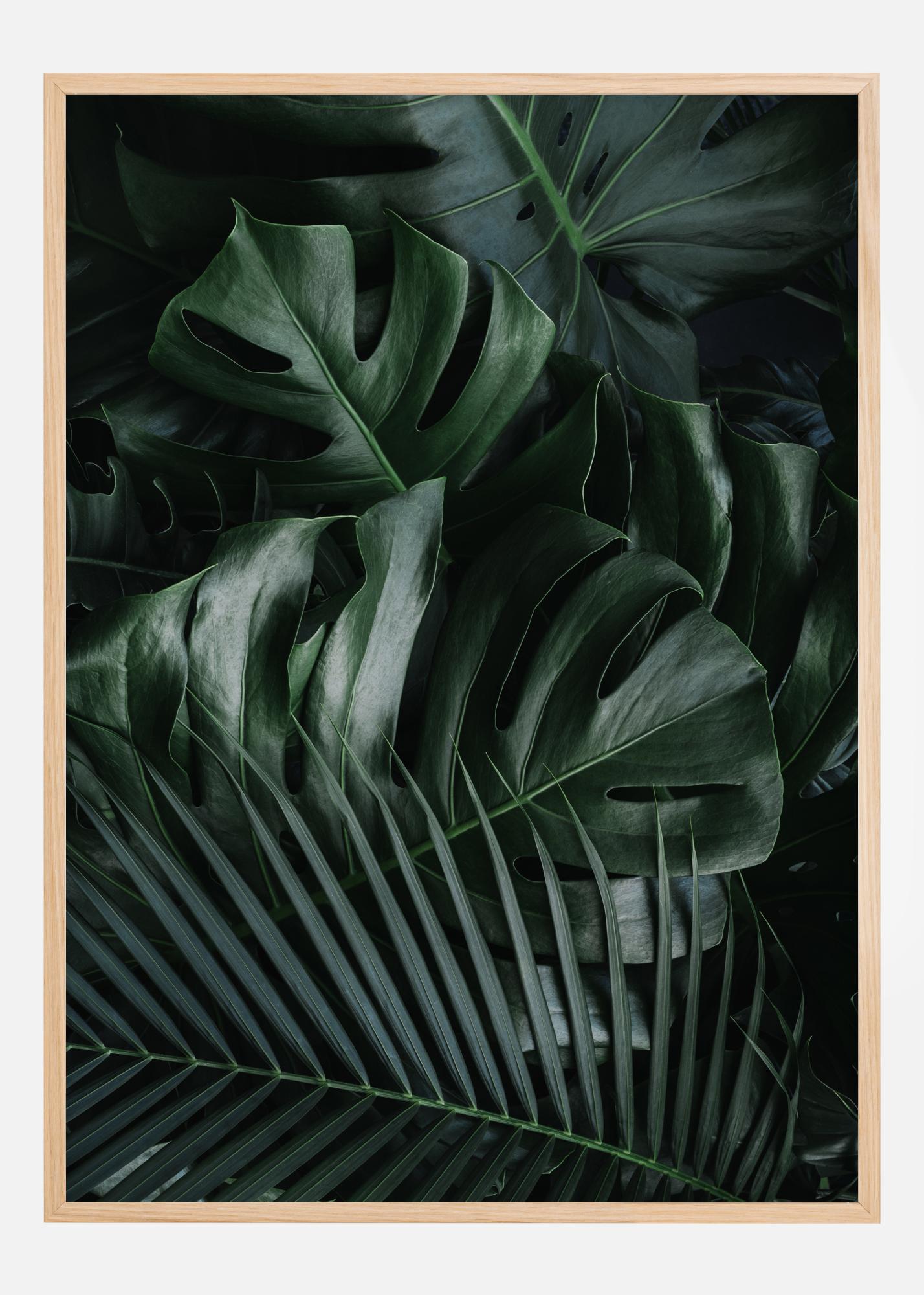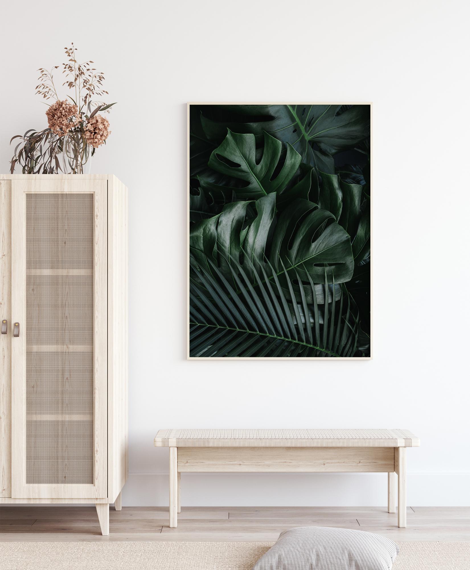 Lehtimäinen muotokuva vihreistä jättipeikon lehdistä ja palmunlehdistä. Luonnonvalo paistaa jättipeikonlehtien yläosaan luoden tummempia sävyjä printin yläosaan. Kokonaiset sahalaitaiset lehdet luovat lämpimän rentouttavan tunnelman. Täydellinen printti kaikille kasveja rakastaville.