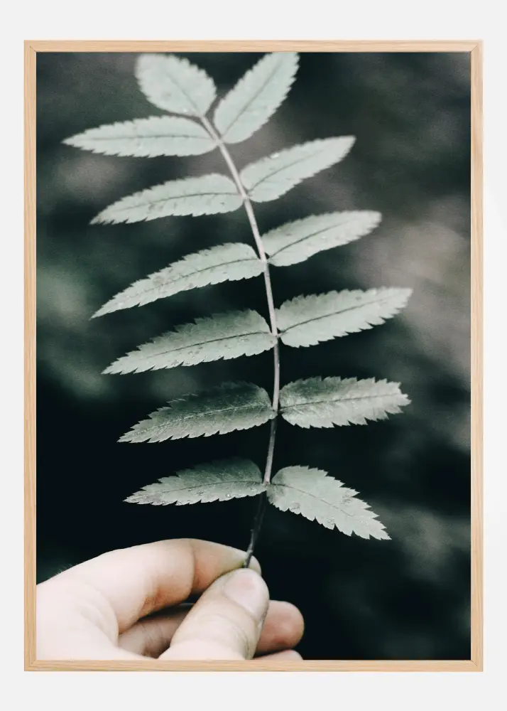 Kimaltava lähikuva vuoristohorsman lehdestä, jota joku pitää kädessään. Kirkkaanvihreät pinnat sahanmuotoisilla terillä nousevat ylös kaarevaa keskiriviä pitkin. Tämä kaunis mutta yksinkertainen painatus on asetettu sumealle taustalle, ja se sopii täydellisesti tavalliselle seinälle.