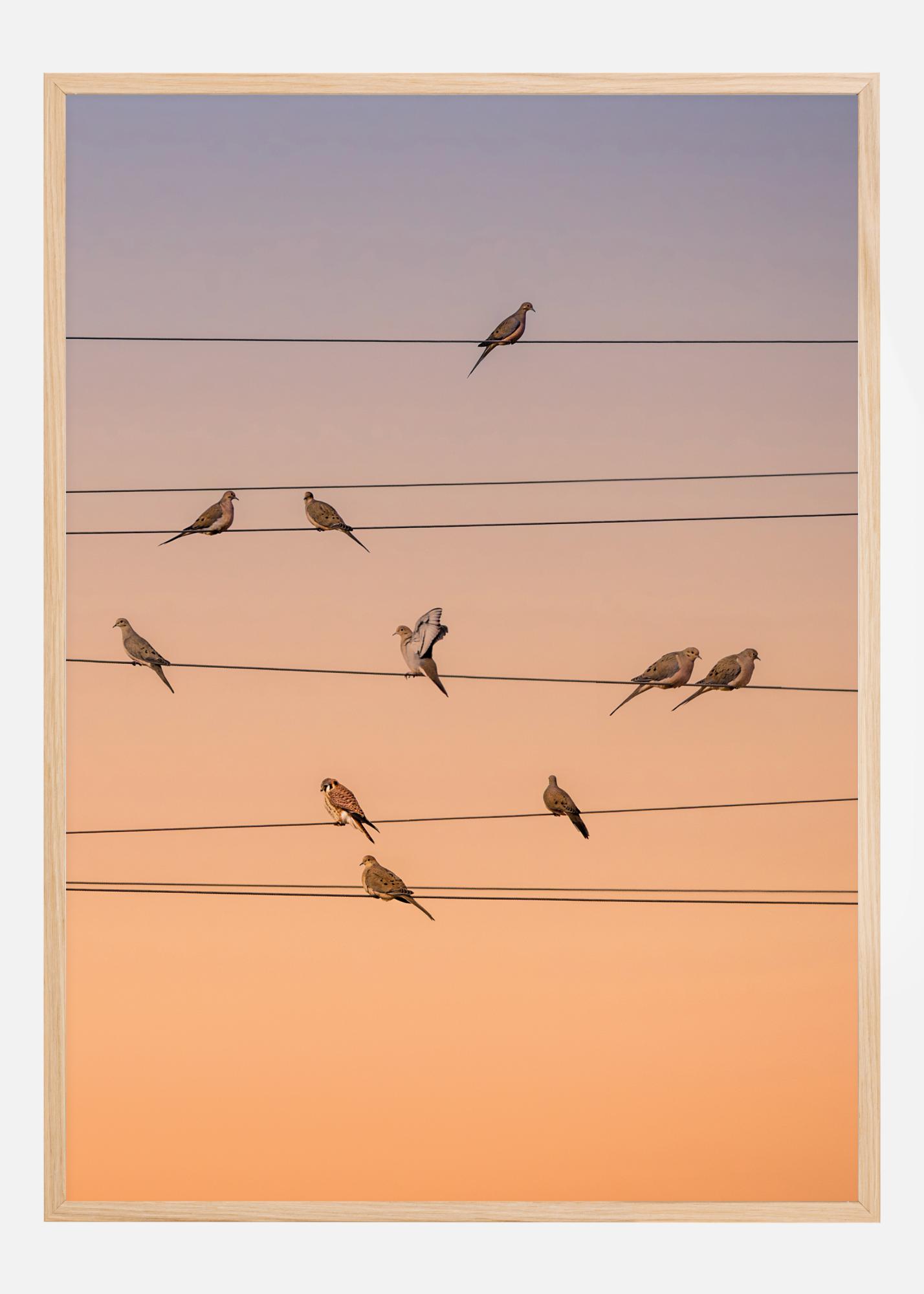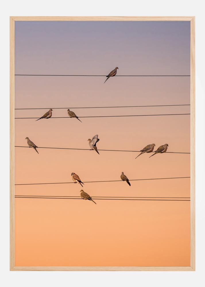 Hämmästyttävä kuva sähkölinjoilla istuvista linnuista. Oranssin iltavalon valaisemina linjat muodostavat nuottirivin kaltaisia kuvioita. Kuvitteellinen nuottirivi antaa täydellisen tunteen lintujen laulusta. Valmis mihin tahansa olohuoneen seinälle.