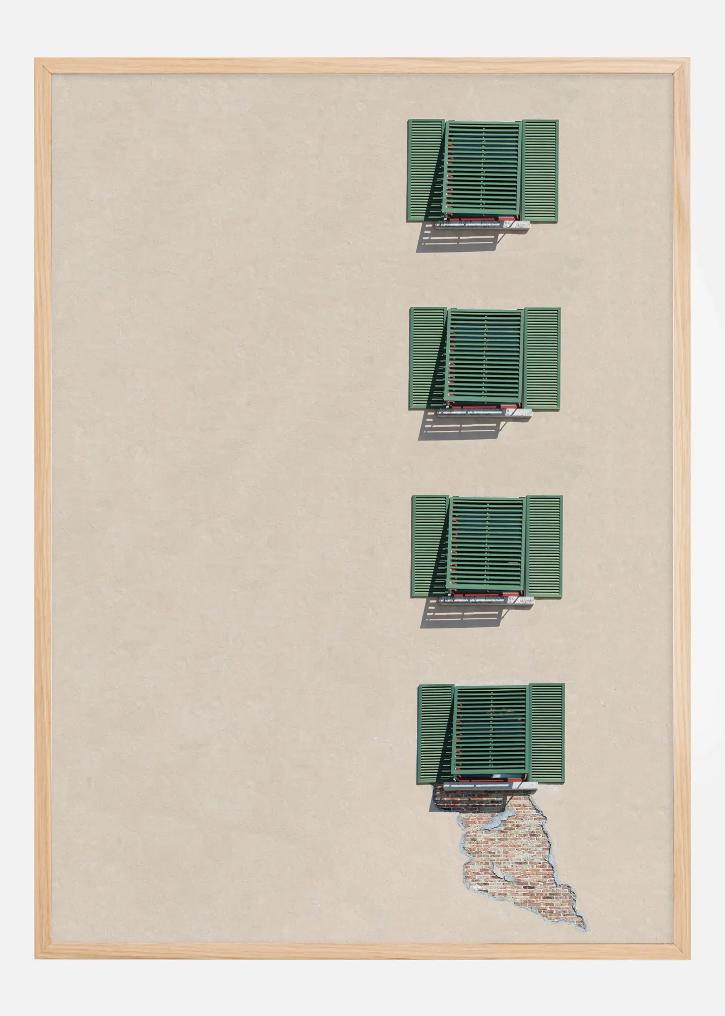 Teos, joka saattaa olla nimeltään "Naapurin Riita", esittelee radikaalin kontrastin järjestyksen ja kaaoksen välillä synkronoitujen ikkunaluukkujen kautta verrattuna viimeiseen ikkunaan, jossa osa seinästä näyttää romahtaneen. Yhtenäiset vihreät ikkunaluukut yksiväristä taustaa vasten osoittavat eräänlaista ennustettavuutta ja rutiinia, kun taas vaurioitunut ikkuna paljastuneine tiiliseinineen rikkoo tämän harmonian ja tuo esiin mahdollisen ristiriidan tai laiminlyönnin tarinan.