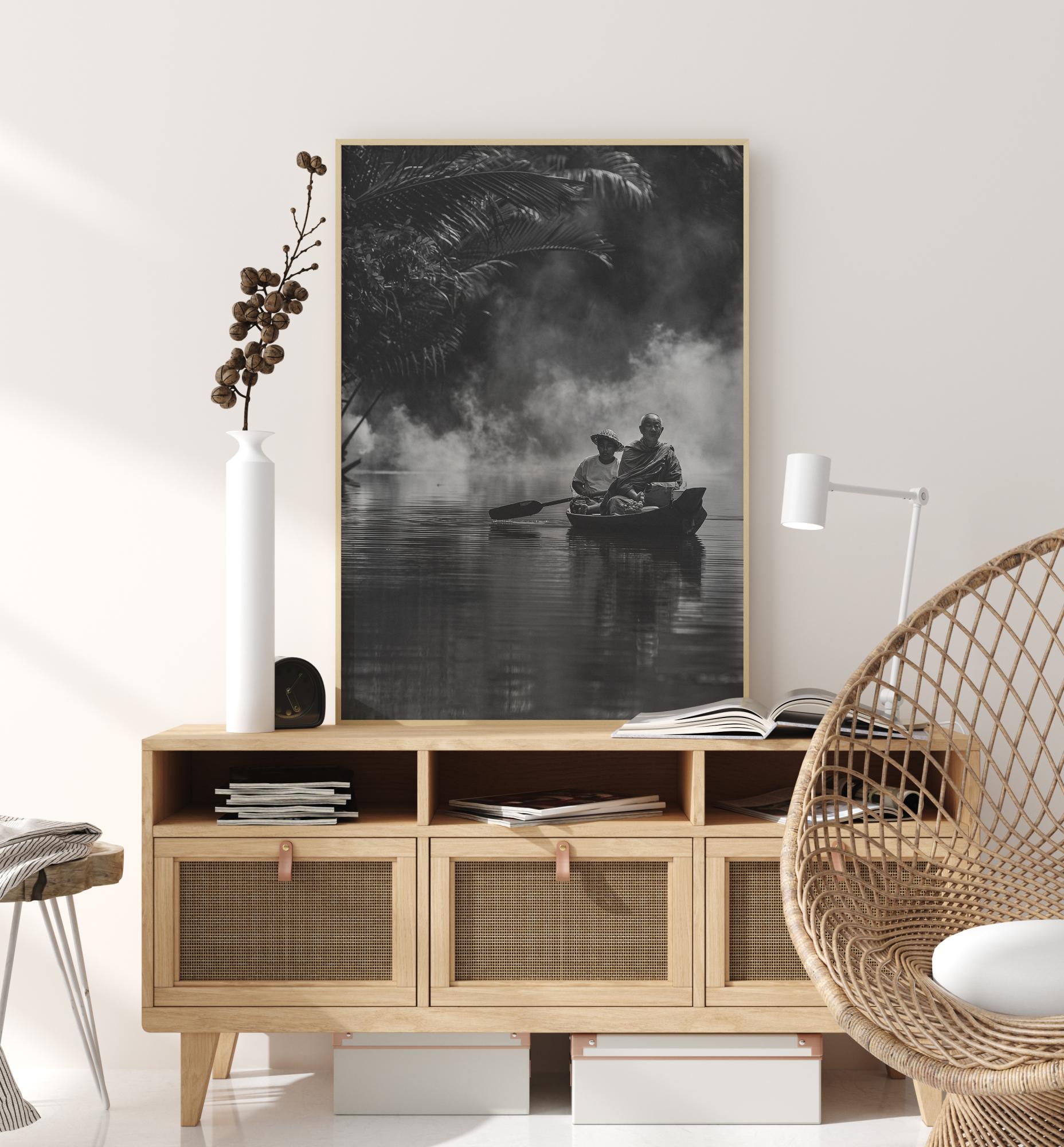 Rauhallinen mustavalkoinen lähikuva kahdesta joella matkustavasta miehestä. Kaksi miestä istuu rauhallisesti thaimaalaisessa gondolikalastusveneessään ja näyttää tarkkailevan ympäristöään. Pilvien läpi paistava luonnollinen auringonvalo heijastaa venettä vedestä. Voit melkein kuulla tämän kuvan hiljaisuuden. Ihanteellinen rauhalliseen ympäristöön.