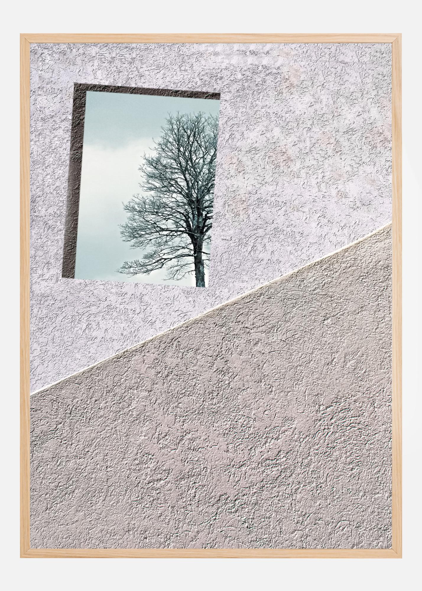 Herkkä juliste vaaleanpunaisesta ja ruskeasta seinästä. Karkeaksi rapattu seinä on jaettu kahteen osaan, vaaleanpunaisella puolella näkyy pilvinen sininen taivas, jonka etualalla on puu, kun taas ruskea seinä on paljas. Luova kuva mihin tahansa moderniin kotiin.