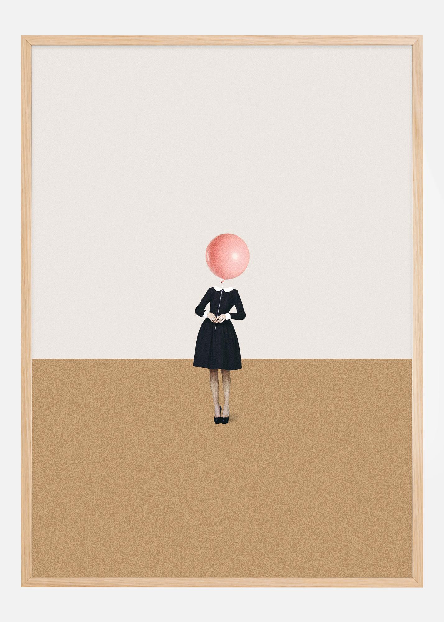 Tämä taiteellinen juliste kiinnittää huomion yksinkertaisella mutta voimakkaalla kuvallaan naisesta, joka on pukeutunut mustaan mekkoon ja seisoo yksin lämpimien hiekkasävyjen taustalla. Hän pitää päänsä yläpuolella täydellistä pyöreää, vaaleanpunaista kuplaa, luoden visuaalisen ja ajatuksia herättävän kontrastin henkilön ja ympäröivän pinnan välille.