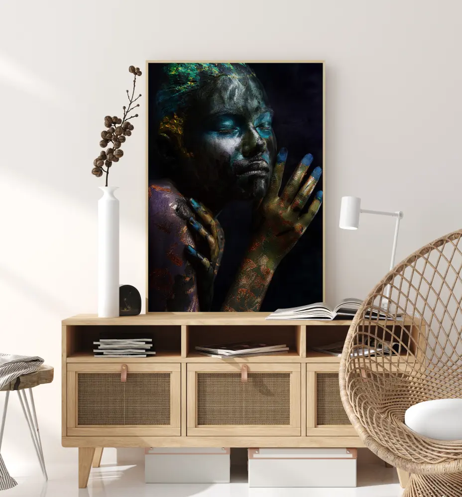 Henkeäsalpaava teos maalin peittämästä naisesta. Mustalla pohjalla oleva nainen on peitetty kirkkaanvärisillä maaleilla. Luonnonvalon paistaessa naisen kasvoihin ja olkapäille, värien voimakkuus korostuu. Kaunis teos, joka tuo väriä valkoiselle seinälle.